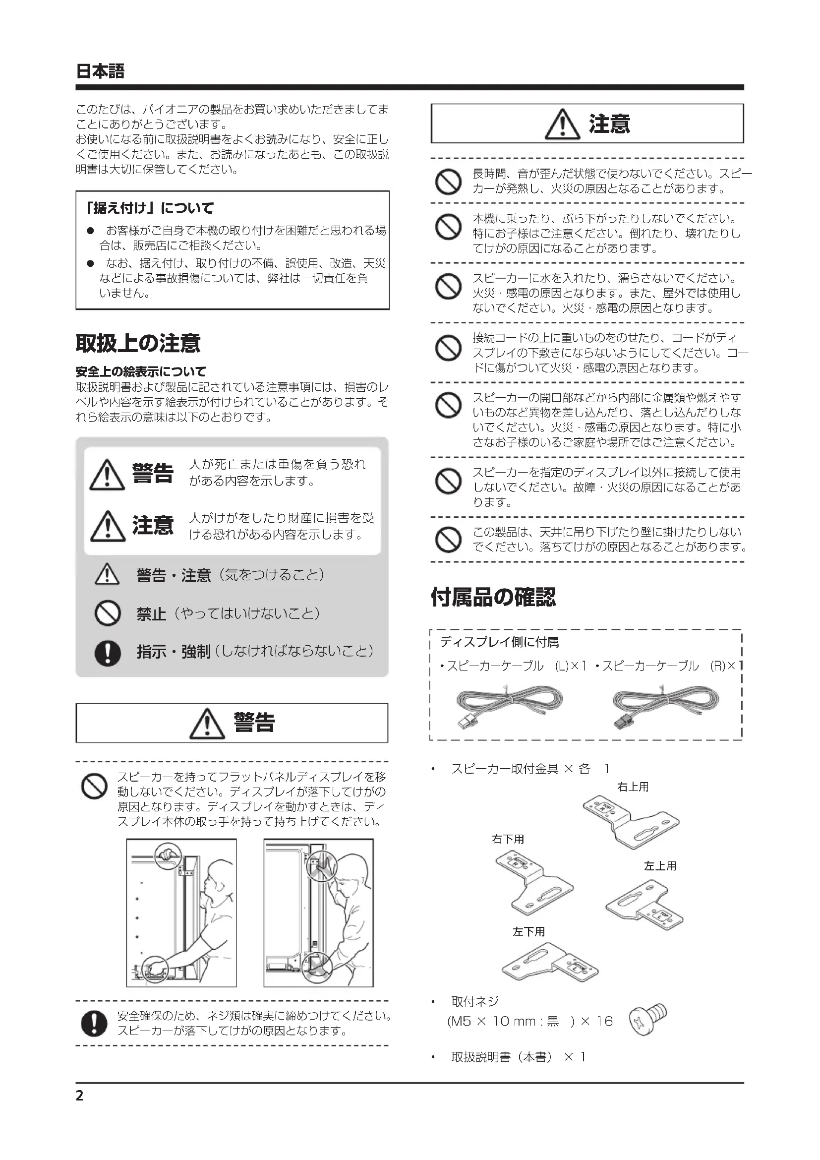 - 取付ネジ (M5×10mm:黒 )×16• 取扱説明書(本書)×1 安全上の絵表示について取扱説明書および製品に記されている注意事項には、損害のレベルや内容を示す絵表示が付けられていることがあります。それら絵表示の意味は以下のとおりです。3
