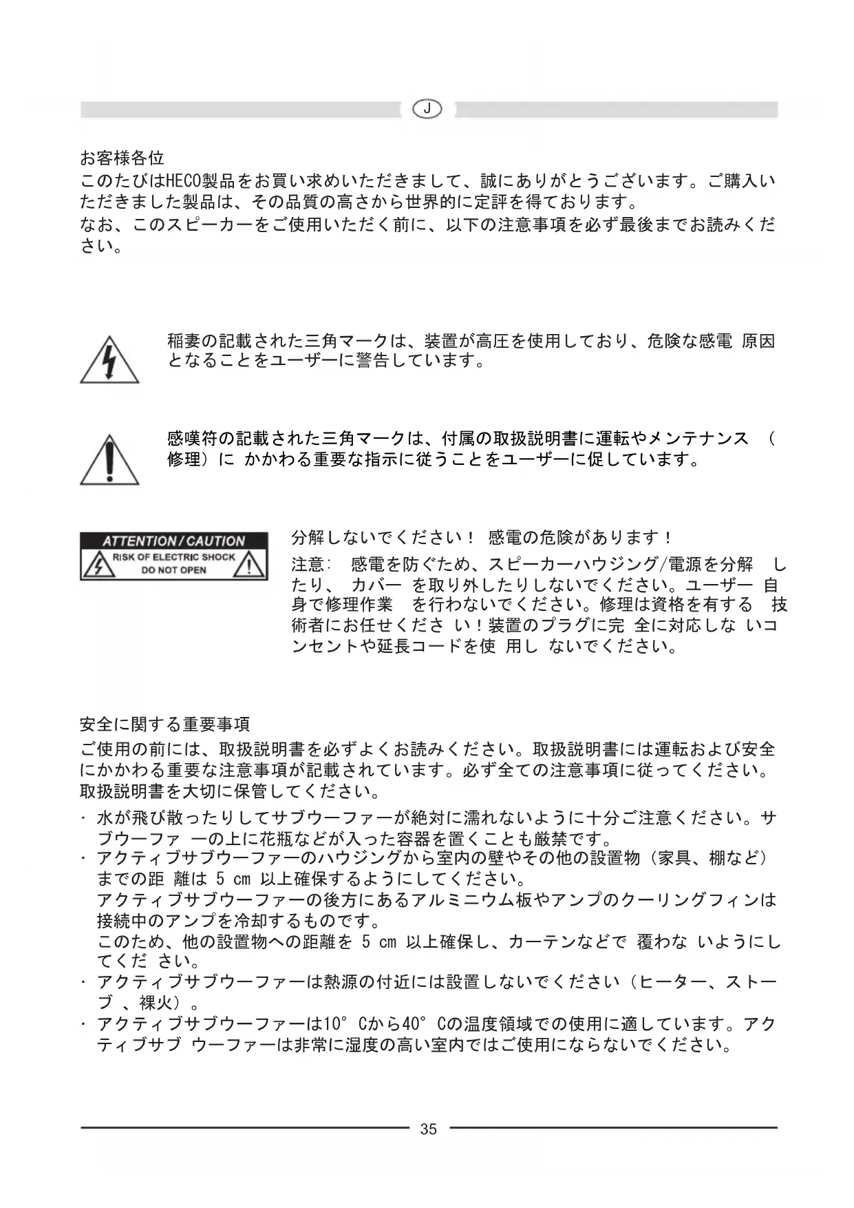 このたびはHECO製品をお買い求めいただきまして、誠にありがとうございます。ご購入い ただきました製品は、その品質の高さから世界的に定評を得ております。 なお、このスピーカーをご使用いただく前に、以下の注意事項を必ず最後までお読みくだ