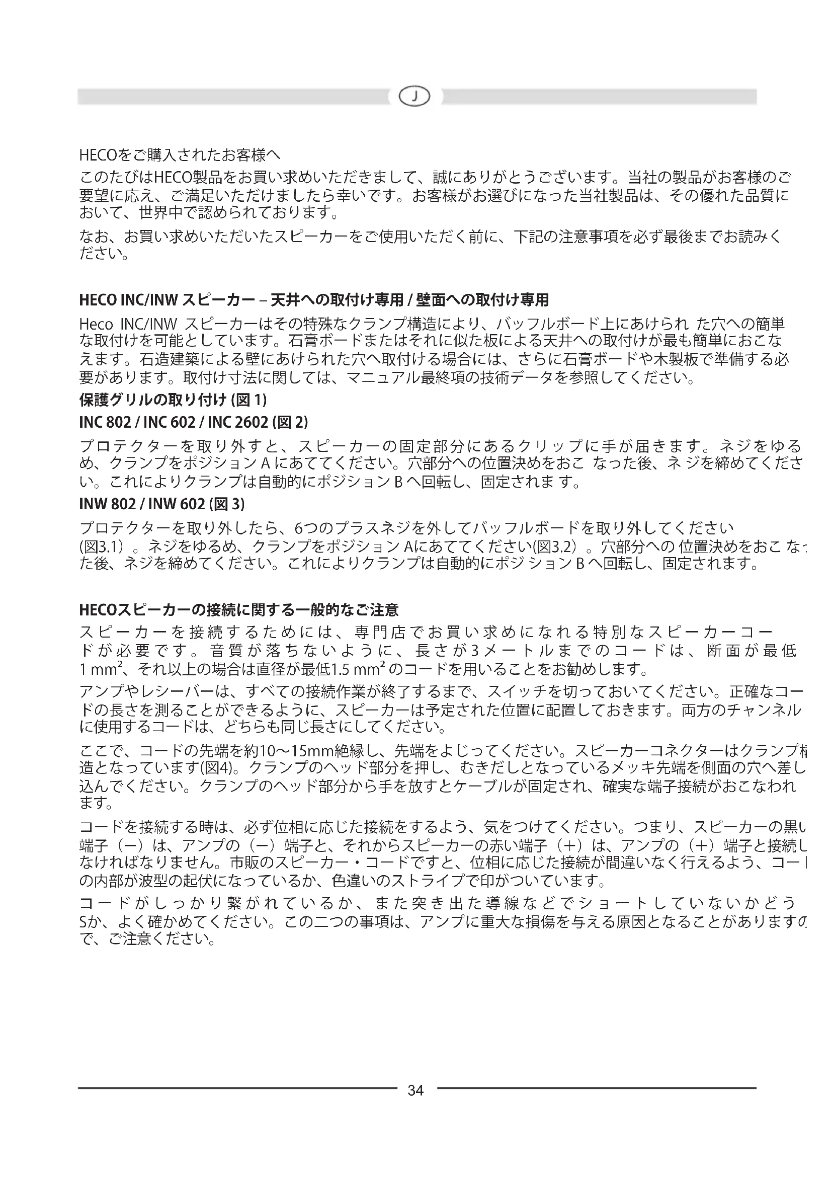 Heco INC/INW スピーカーはその特殊なクランプ構造により、バッフルボード上にあけられ た穴への簡単 な取付けを可能としています。石膏ボードまたはそれに似た板による天井への取付けが最も簡単におこな えます。石造建築による壁にあけられた穴へ取付ける場合には、さらに石膏ボードや木製板で準備する必 要があります。取付け寸法に関しては、マニュアル最終項の技術データを参照してください。 保護グリルの取り付け (図 1) INC 802 / INC 602 / INC 2602 (図 2) プロテクターを取り外すと、スピーカーの固定部分にあるクリップに手が届きます。ネジをゆる め、クランプをポジション A にあててください。穴部分への位置決めをおこ なった後、ネ ジを締めてくださ い。これによりクランプは自動的にポジション B へ回転し、固定されま す。 INW 802 / INW 602 (図 3) プロテクターを取り外したら、6つのプラスネジを外してバッフルボードを取り外してください (図3.1)。ネジをゆるめ、クランプをポジション Aにあててください(図3.2)。穴部分への 位置決めをおこ なっ た後、ネジを締めてください。これによりクランプは自動的にポジ ション B へ回転し、固定されます。 HECOスピーカーの接続に関する一般的なご注意 スピーカーを接続するためには、専門店でお買い求めになれる特別なスピーカーコー ドが必要です。音質が落ちないように、長さが3メートルまでのコードは、断面が最低 1 mm²、それ以上の場合は直径が最低1.5 mm² のコードを用いることをお勧めします。 アンプやレシーバーは、すべての接続作業が終了するまで、スイッチを切っておいてください。正確なコー ドの長さを測ることができるように、スピーカーは予定された位置に配置しておきます。両方のチャンネル に使用するコードは、どちらも同じ長さにしてください。 ここで、コードの先端を約10~15mm絶縁し、先端をよじってください。スピーカーコネクターはクランプ構 造となっています(図4)。クランプのヘッド部分を押し、むきだしとなっているメッキ先端を側面の穴へ差し 込んでください。クランプのヘッド部分から手を放すとケーブルが固定され、確実な端子接続がおこなわれ
