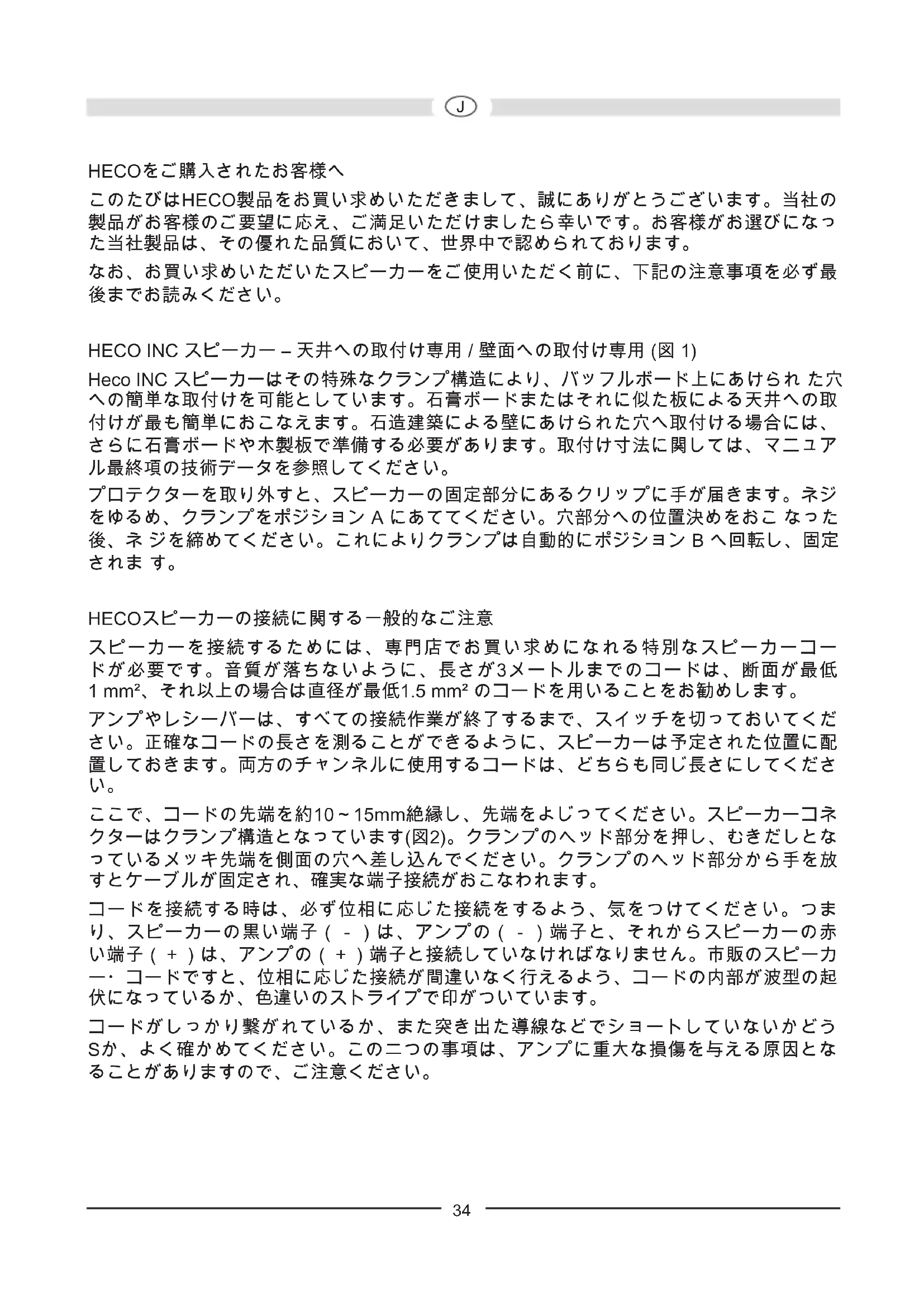 CHN 33HECOをご購入されたお客様へ このたびはHECO製品をお買い求めいただきまして、誠にありがとうございます。当社の 製品がお客様のご要望に応え、ご満足いただけましたら幸いです。お客様がお選びになっ た当社製品は、その優れた品質において、世界中で認められております。 なお、お買い求めいただいたスピーカーをご使用いただく前に、下記の注意事項を必ず最 後までお読みください。 HECO INC スピーカー – 天井への取付け専用 / 壁面への取付け専用 (図 1) Heco INC スピーカーはその特殊なクランプ構造により、バッフルボード上にあけられ た穴 への簡単な取付けを可能としています。石膏ボードまたはそれに似た板による天井への取 付けが最も簡単におこなえます。石造建築による壁にあけられた穴へ取付ける場合には、 さらに石膏ボードや木製板で準備する必要があります。取付け寸法に関しては、マニュア ル最終項の技術データを参照してください。 プロテクターを取り外すと、スピーカーの固定部分にあるクリップに手が届きます。ネジ をゆるめ、クランプをポジション A にあててください。穴部分への位置決めをおこ なった 後、ネ ジを締めてください。これによりクランプは自動的にポジション B へ回転し、固定