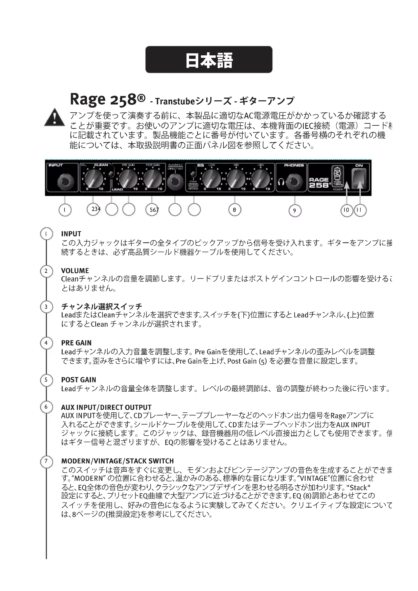 - Transtubeシリーズ - ギターアンプ アンプを使って演奏する前に、本製品に適切なAC電源電圧がかかっているか確認する ことが重要です。お使いのアンプに適切な電圧は、本機背面のIEC接続(電源)コード横 に記載されています。製品機能ごとに番号が付いています。各番号横のそれぞれの機 能については、本取扱説明書の正面パネル図を参照してください。 INPUT この入力ジャックはギターの全タイプのピックアップから信号を受け入れます。ギターをアンプに接 続するときは、必ず高品質シールド機器ケーブルを使用してください。 VOLUME Cleanチャンネルの音量を調節します。リードプリまたはポストゲインコントロールの影響を受けるこ