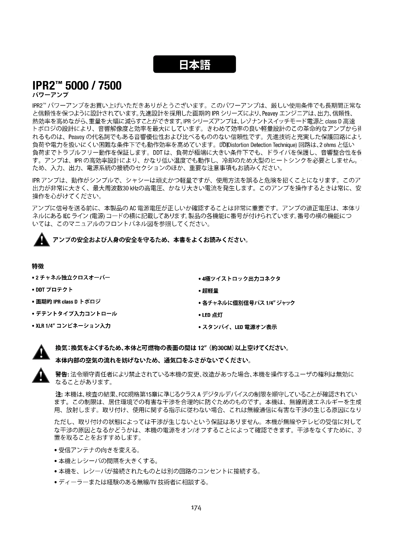 パワーアンプをお買い上げいただきありがとうございます。このパワーアンプは、厳しい使用条件でも長期間正常な動作 と信頼性を保つように設計されています。先進設計を採用した画期的 IPR シリーズにより、Peavey エンジニアは、出力、信頼性、 熱効率を高めながら、重量を大幅に減らすことができます。IPR シリーズアンプは、レゾナントスイッチモード電源と class D 高速 トポロジの設計により、音響解像度と効率を最大にしています。きわめて効率の良い軽量設計のこの革命的なアンプから得ら れるものは、Peavey の代名詞でもある音響優位性および比べるもののない信頼性です。先進技術と充実した保護回路により、 負荷や電力を扱いにくい困難な条件下でも動作効率を高めています。DDT