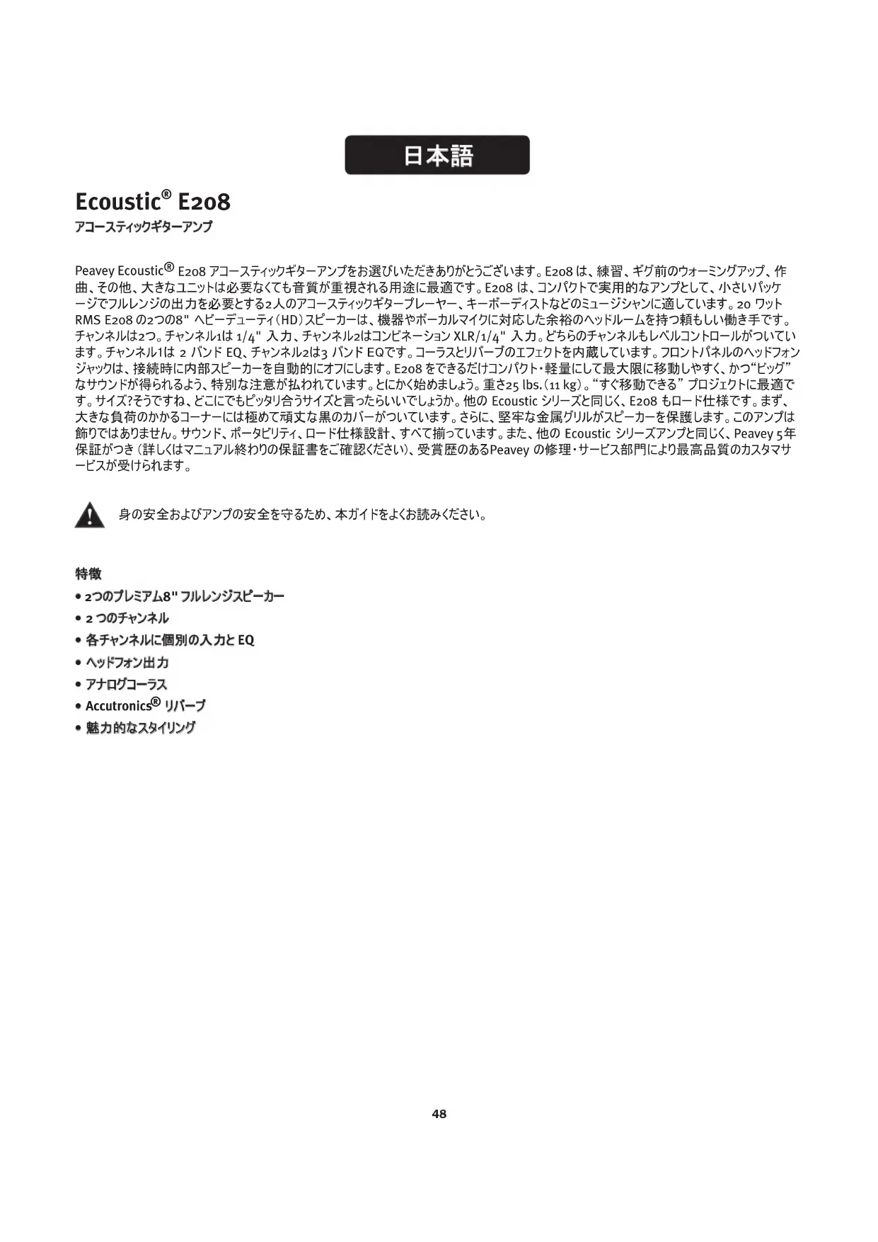 チャンネルは2つ。チャンネル1は 1/4" 入力、チャンネル2はコンビネーション XLR/1/4" 入力。どちらのチャンネルもレベルコントロールがついてい ます。チャンネル1は 2 バンド EQ、チャンネル2は3 バンド EQです。コーラスとリバーブのエフェクトを内蔵しています。フロントパネルのヘッドフォン ジャックは、接続時に内部スピーカーを自動的にオフにします。E208 をできるだけコンパクト・軽量にして最大限に移動しやすく、かつ“ビッグ” なサウンドが得られるよう、特別な注意が払われています。とにかく始めましょう。重さ25 lbs.(11 kg)。“すぐ移動できる” プロジェクトに最適で す。サイズ?そうですね、どこにでもピッタリ合うサイズと言ったらいいでしょうか。他の Ecoustic シリーズと同じく、E208 もロード仕様です。まず、 大きな負荷のかかるコーナーには極めて頑丈な黒のカバーがついています。さらに、堅牢な金属グリルがスピーカーを保護します。このアンプは 飾りではありません。サウンド、ポータビリティ、ロード仕様設計、すべて揃っています。また、他の Ecoustic シリーズアンプと同じく、Peavey 5年 保証がつき (詳しくはマニュアル終わりの保証書をご確認ください)、受賞歴のあるPeavey の修理・サービス部門により最高品質のカスタマサ ービスが受けられます。 身の安全およびアンプの安全を守るため、本ガイドをよくお読みください。