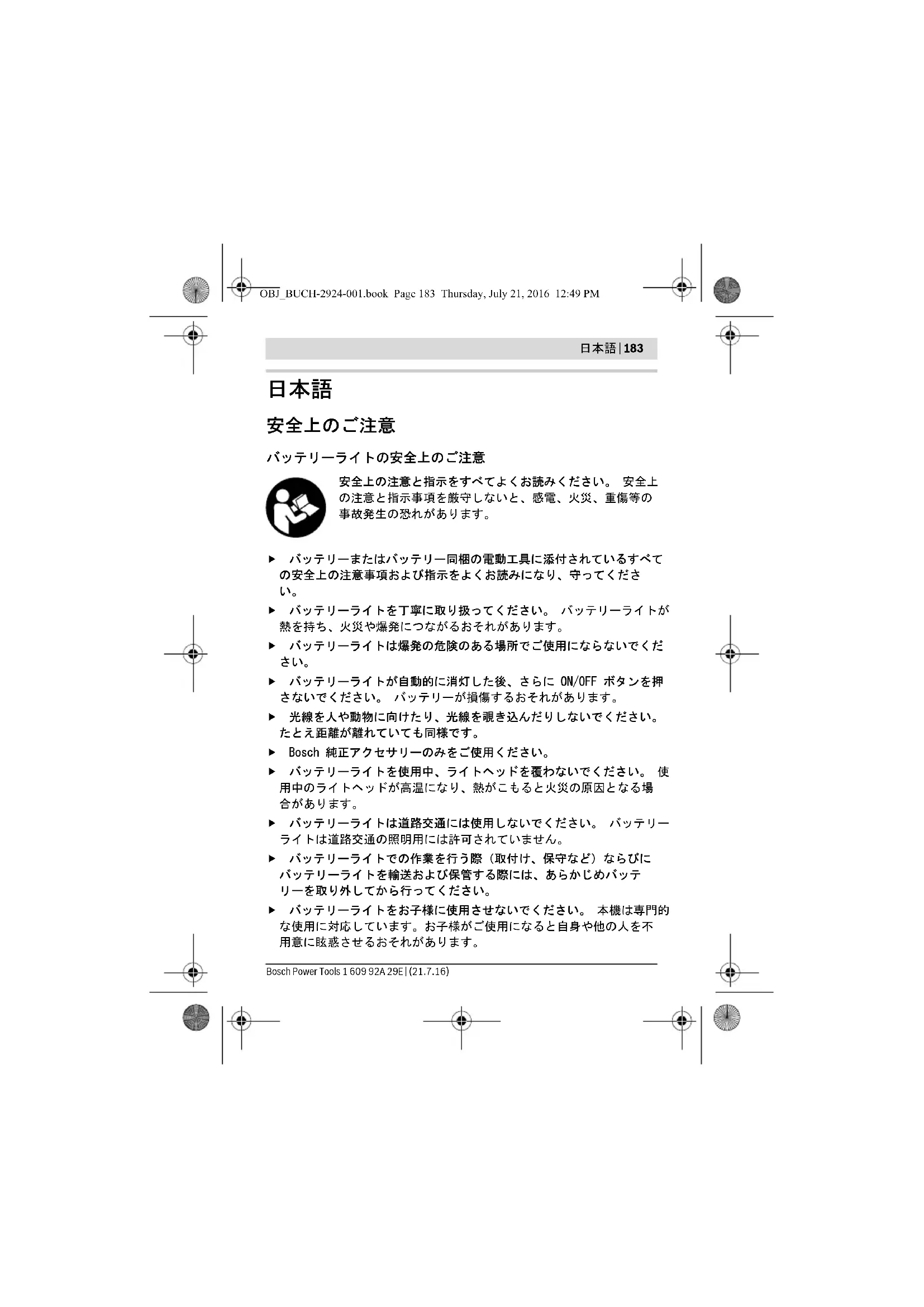 バッテリーライトは、乾燥した屋内・屋外で限られた照射範囲・時間で 使用する携帯型の照明であり、一般的な室内照明には適していません。 OBJ_BUCH-2924-001.book Page 184 Thursday, July 21, 2016 12:49 PM日本語 | 185 Bosch Power Tools 1 609 92A 29E | (21.7.16)