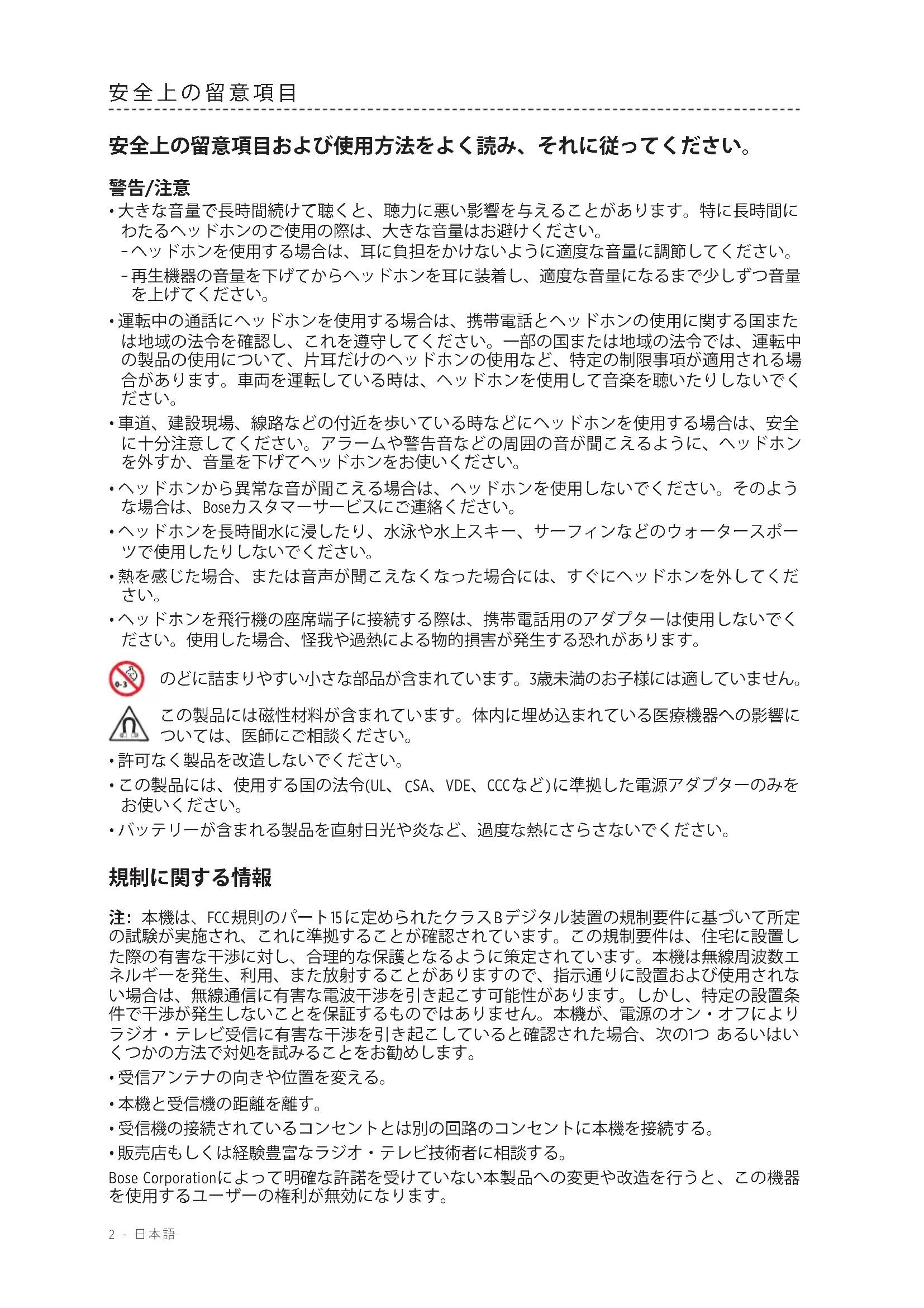 - ヘッドホンから異常な音が聞こえる場合は、ヘッドホンを使用しないでください。そのよう な場合は、Boseカスタマーサービスにご連絡ください。
