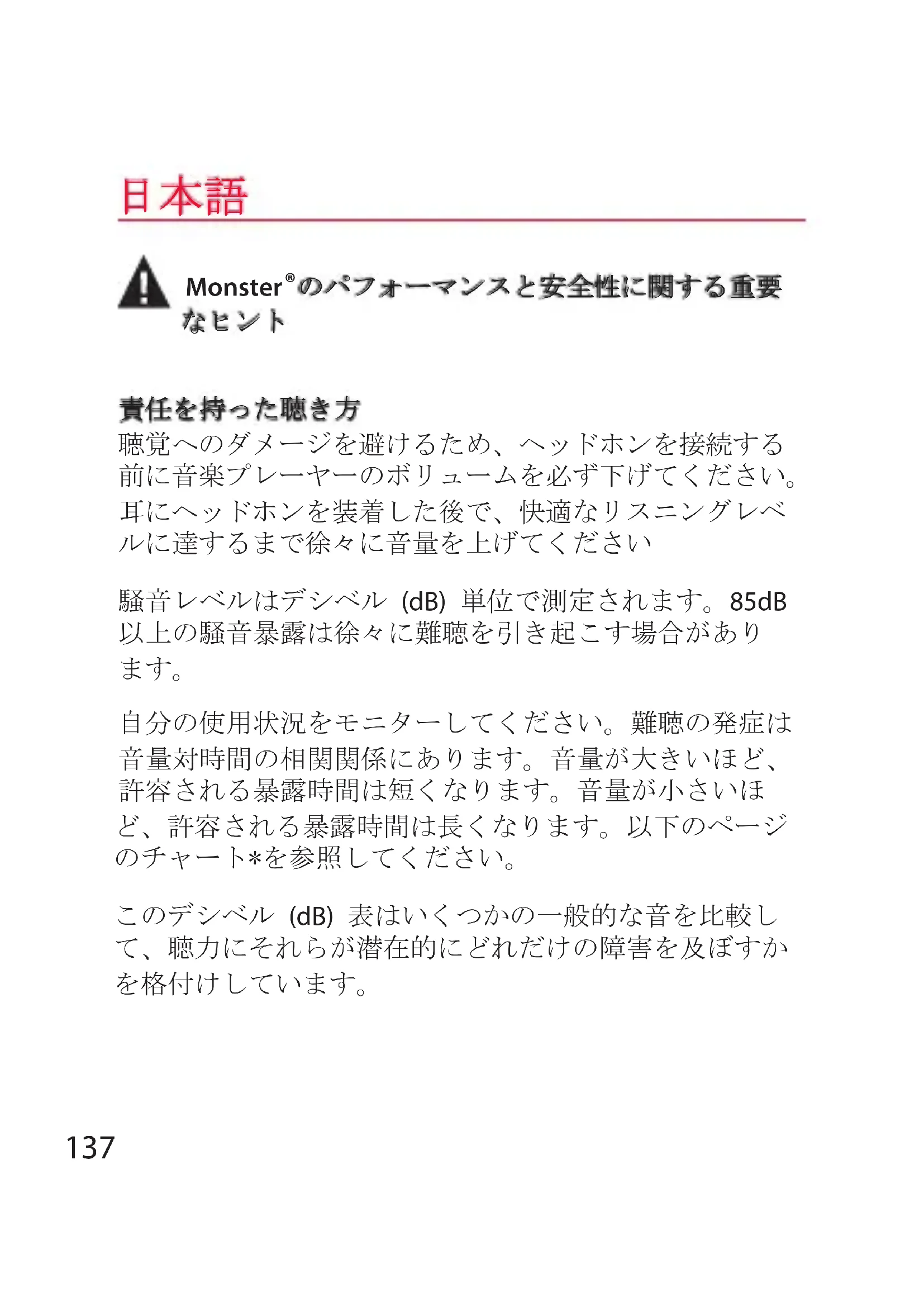 聴覚へのダメージを避けるため、ヘッドホンを接続する 前に音楽プレーヤーのボリュームを必ず下げてください。 耳にヘッドホンを装着した後で、快適なリスニングレベ ルに達するまで徐々に音量を上げてください 騒音レベルはデシベル (dB) 単位で測定されます。85dB 以上の騒音暴露は徐々に難聴を引き起こす場合があり