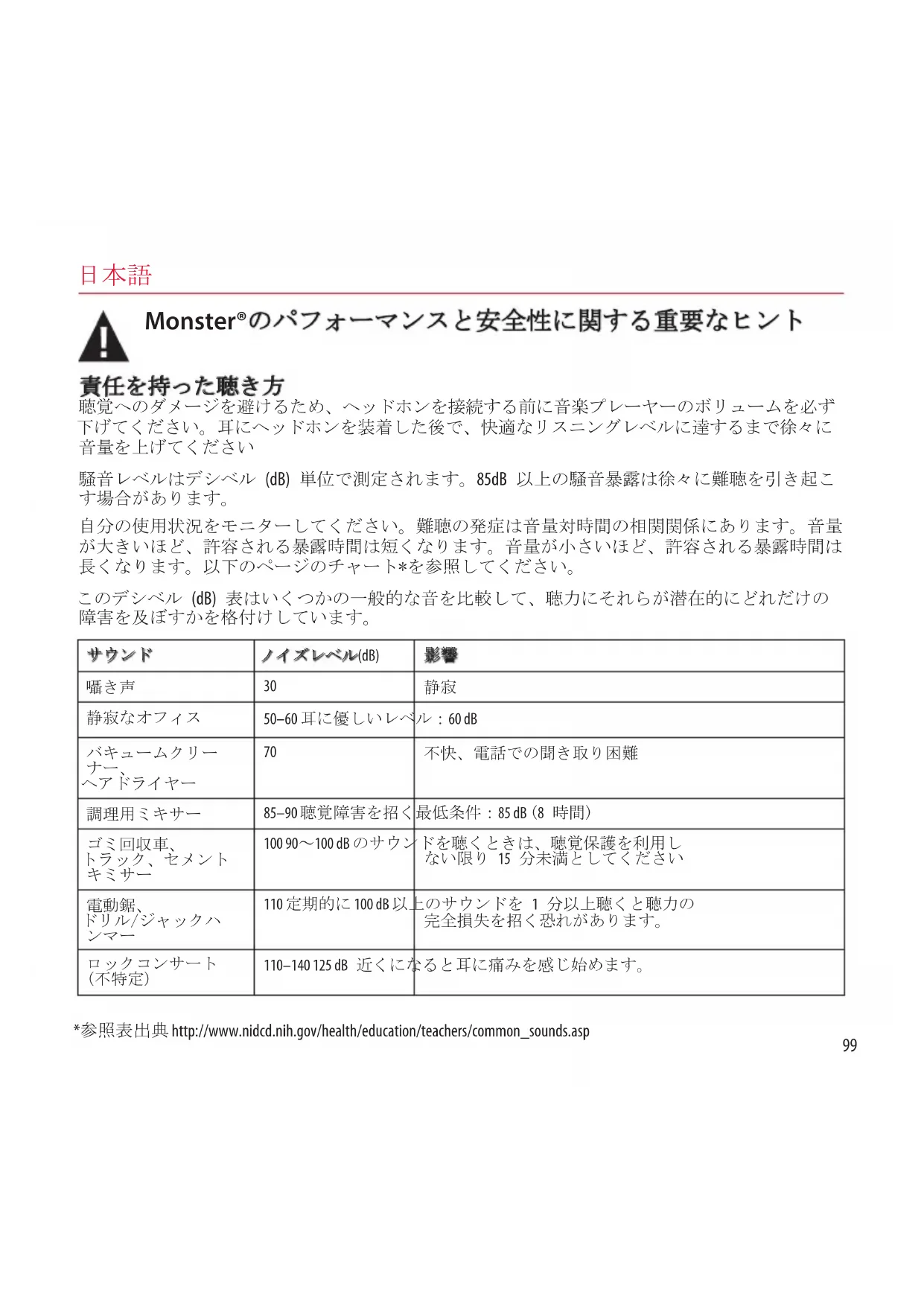 自分の使用状況をモニターしてください。難聴の発症は音量対時間の相関関係にあります。音量が大きいほど、許容される暴露時間は短くなります。音量が小さいほど、許容される暴露時間は長くなります。以下のページのチャート*を参照してください。