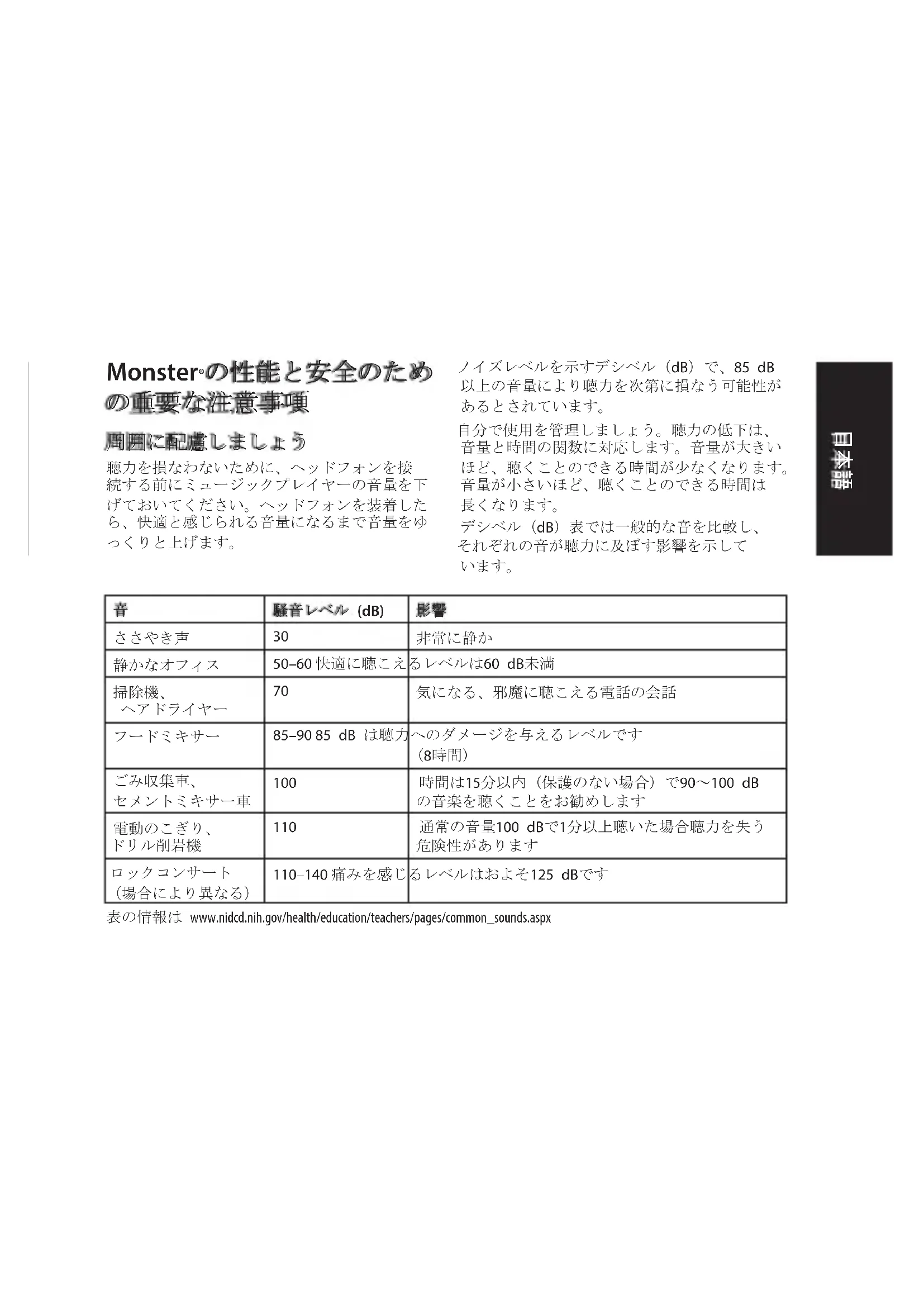 110–140 痛みを感じるレベルはおよそ125 dBです 表の情報は www.nidcd.nih.gov/health/education/teachers/pages/common_sounds.aspx 日本語機器を最大限に活用し、すぐれたオーディオ性 能を安全な音量でお楽しみください。 当社のヘ ッドフォンなら、これまでに得られなかった低 音のすみずみまで、クリアに聴こえます。 安全な音量の設定方法と、その他の安全ガイド ラインについては、消費者電子安全協会のホー ムページwww.ce.orgをご覧ください。騒音性 聴力損失 (NIHL) の予防法と、騒音による聴 力への影響のリストは、難聴研究会(Deafness Research Foundation)のホームページwww.drf. orgをご覧ください。