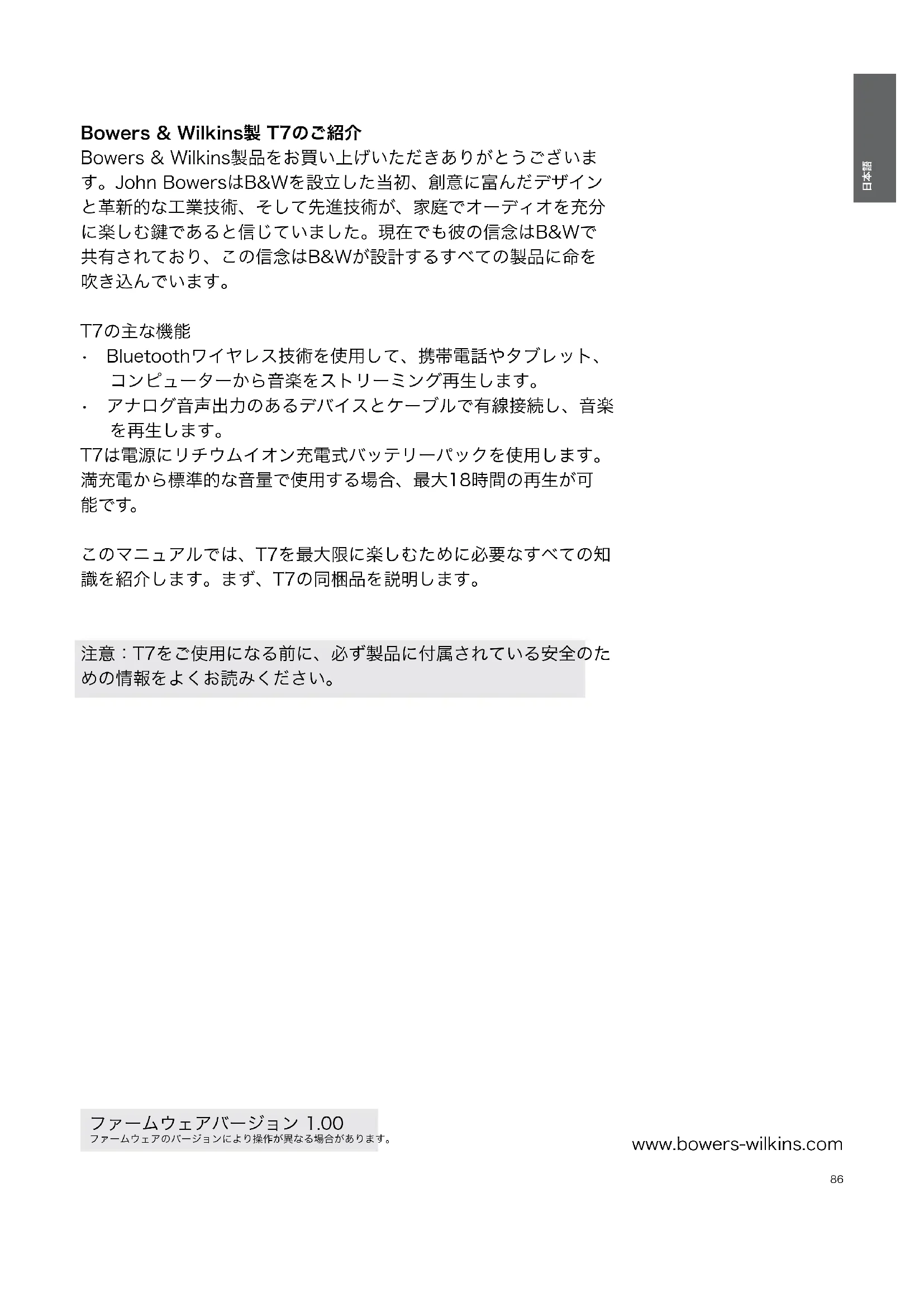 www.bowers-wilkins.com Bowers & Wilkins製 T7のご紹介 Bowers & Wilkins製品をお買い上げいただきありがとうございま す。John BowersはB&Wを設立した当初、創意に富んだデザイン と革新的な工業技術、そして先進技術が、家庭でオーディオを充分 に楽しむ鍵であると信じていました。現在でも彼の信念はB&Wで 共有されており、この信念はB&Wが設計するすべての製品に命を