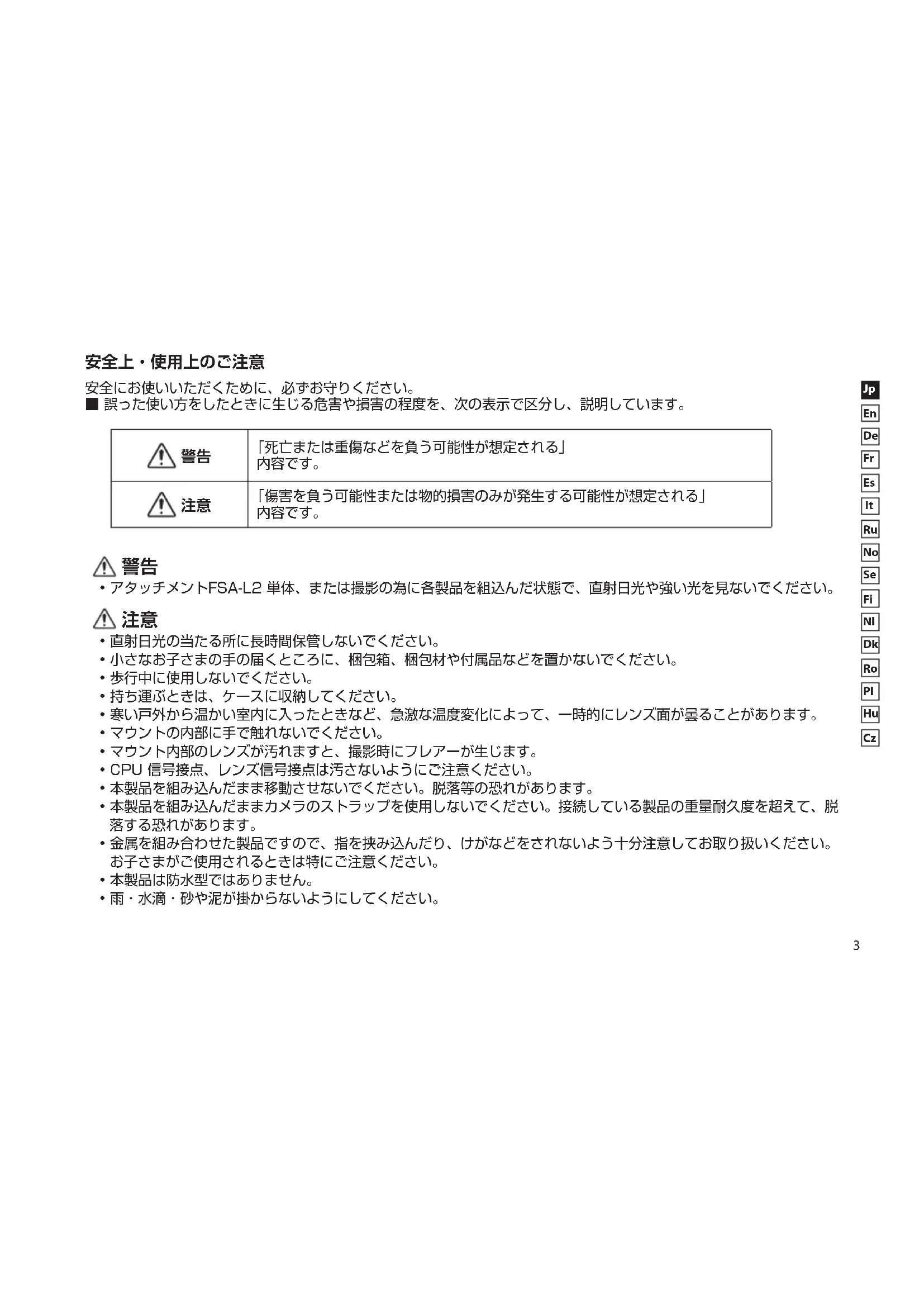 - アタッチメントFSA-L2 単体、または撮影の為に各製品を組込んだ状態で、直射日光や強い光を見ないでください。