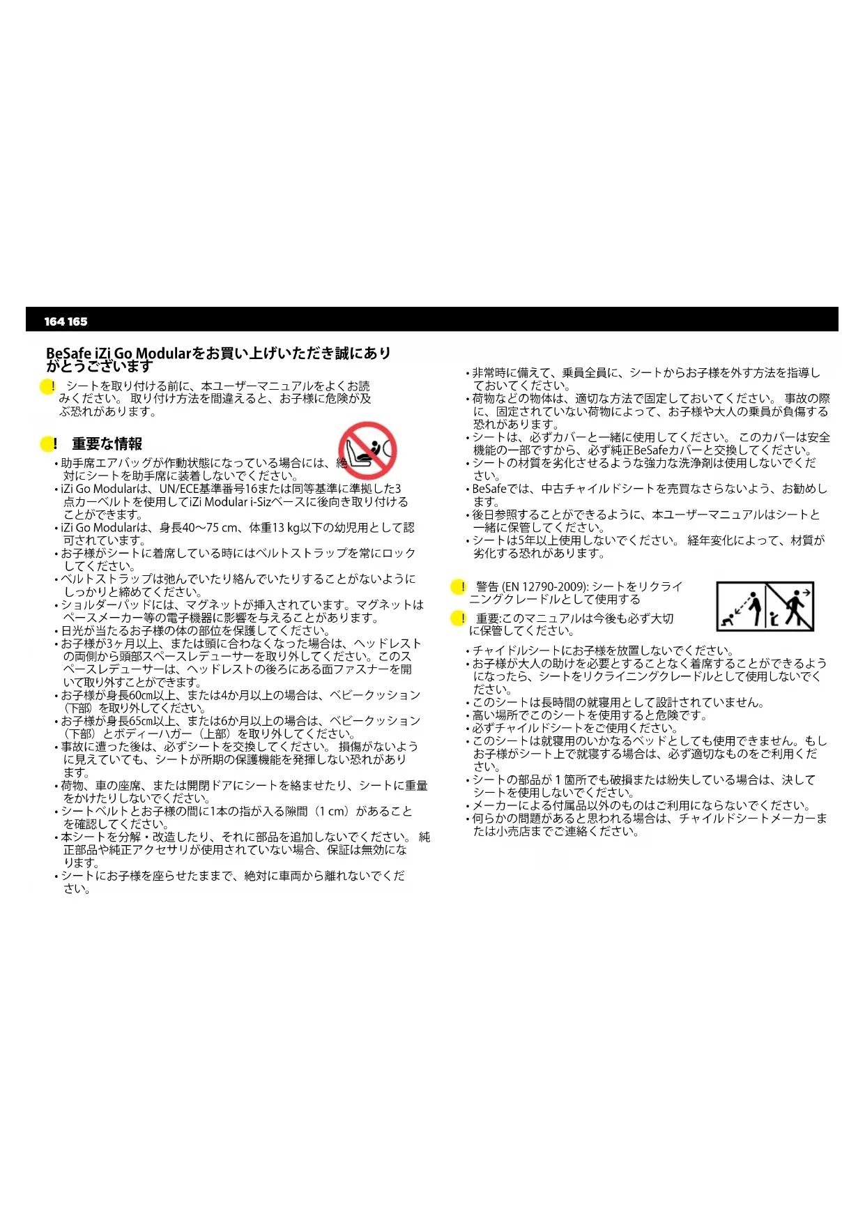 - シートは5年以上使用しないでください。経年変化によって、材質が 劣化する恐れがあります。 ! 警告(EN12790-2009):シートをリクライ ニングクレードルとして使用する ! 重要:このマニュアルは今後も必ず大切