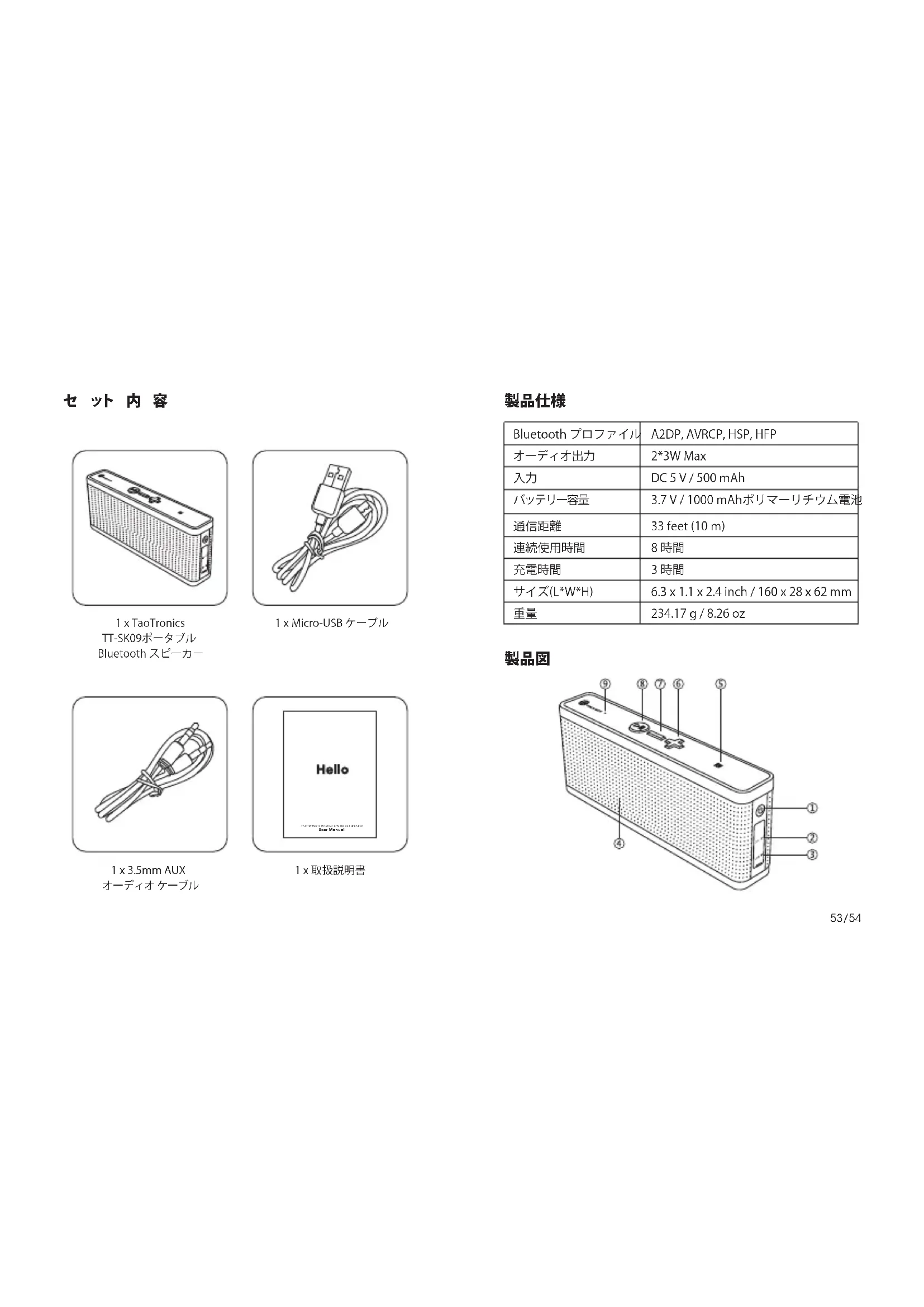 User Manual 1xTaoTronics TT-SK09ポータブル Bluetoothスピーカー 1xMicro-USBケーブル 1x3.5mmAUX