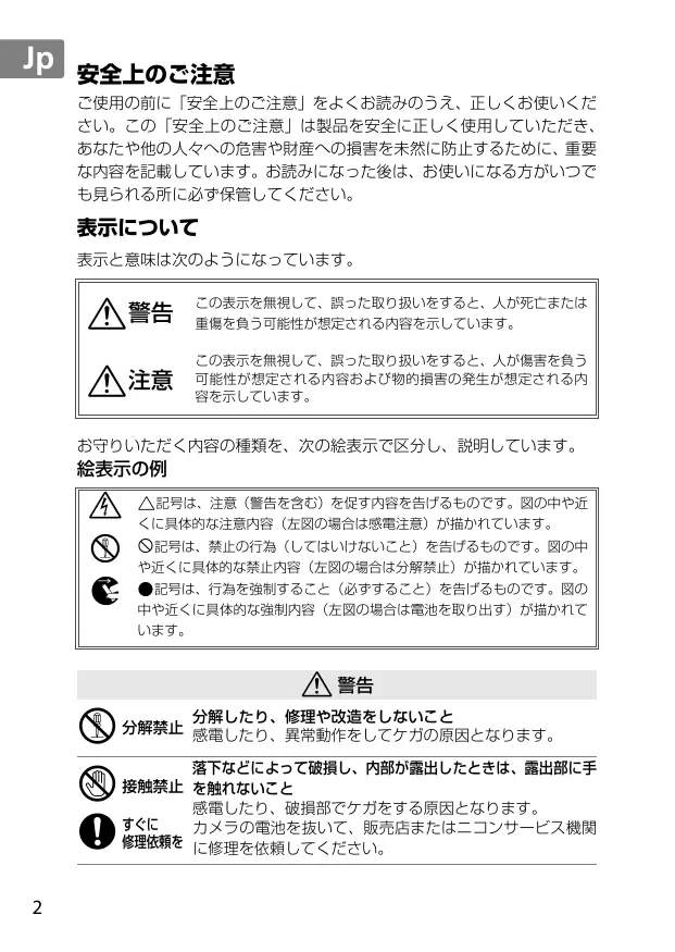 分解したり、修理や改造をしないこと 分解禁止 感電したり、異常動作をしてケガの原因となります。 落下などによって破損し、内部が露出したときは、露出部に手 接触禁止 を触れないこと 感電したり、破損部でケガをする原因となります。 すぐに カメラの電池を抜いて、販売店またはニコンサービス機関 修理依頼を に修理を依頼してください。
