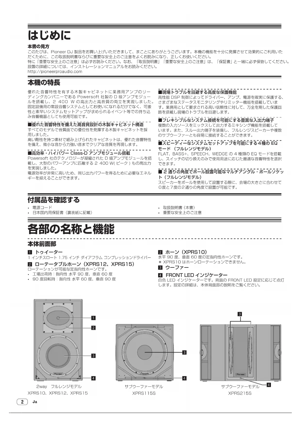 本書の見方このたびは、Pioneer DJ 製品をお買い上げいただきまして、まことにありがとうございます。本機の機能を十分に発揮させて効果的にご利用いただくために、この取扱説明書ならびに重要な安全上のご注意をよくお読みになり、正しくお使いください。特に「重要な安全上のご注意」は必ずお読みください。なお、「取扱説明書」「重要な安全上のご注意」は、「保証書」 と一緒に必ず保管してください。設置の詳細については、インストレーションマニュアルをお読みください。http://pioneerproaudio.com 優れた音響特性を有する木製キャビネットに業務用アンプのリーディングカンパニーである Powersoft 社製の D 級アンプモジュールを搭載し、2400 W の高出力と高音質の両立を実現しました。 固定設備用の常設音響システムとしてお使いになれるだけでなく、可搬性と素早いシステムセットアップが求められるイベント等での持ち込み音響機器としても使用可能です。■優れた音響特性を備えた高音質設計の木製キャビネット構造 すべてのモデルで音質面での優位性を発揮する木製キャビネットを採用しました。 高い剛性を持つ素材で組み上げられたキャビネットは、優れた音響特性を備え、微小な音から力強い音までクリアな音質を再現します。■高効率・ハイパワー Class-D アンプモジュール搭載 Powersoft 社のテクノロジーが凝縮された D 級アンプモジュールを搭載し、大型のパワーアンプに匹敵する 2400 W( ピーク ) もの高出力を実現しました。 電源効率が非常に高いため、同じ出力パワーを得るために必要なエネルギーを抑えることができます。■現場トラブルを回避する高度な保護機能 高性能 DSP 制御によってドライバー、アンプ、電源を確実に保護する、さまざまなステータスモニタリングやリミッター機能を搭載しています。業務用として要求される高い信頼性に対して、万全を期した保護回路を搭載し現場のトラブルを回避します。■フレキシブルなシステム接続を可能にする豊富な入出力端子 複数の入力ソースをミックスして出力するミキシング機能を搭載しています。また、スルー出力端子を装備し、フルレンジスピーカーや複数のサブウーファーとも容易に接続することができます。■スピーディーなシステムセットアップを可能にする4種の EQモード (フルレンジモデル) FLAT、BASS+、SPEECH、WEDGE の 4 種類の EQ モードを搭載し、スイッチの切り換えのみで使用用途に応じた最適な音響特性を選択できます。■ 2 通りの角度でポール設置可能なマルチアングル・ポールソケット(フルレンジモデル) スピーカーをポールを使用して設置する際に、会場の大きさに合わせて0度と7度の2通りの角度で設置が可能です。