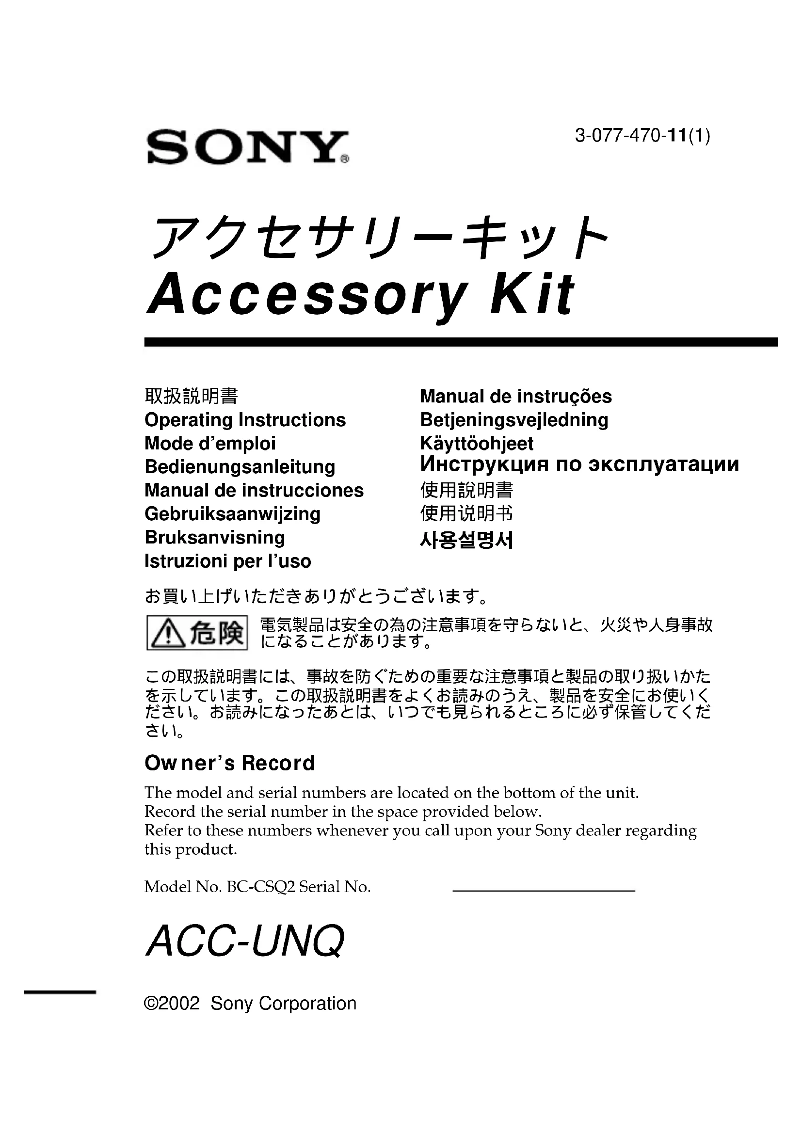3-077-470-11(1) ACC-UNQ ©2002 Sony Corporation Accessory Kit 取扱説明書Operating InstructionsMode d’emploiBedienungsanleitungManual de instruccionesGebruiksaanwijzingBruksanvisningIstruzioni per l’usoManual de instruçõesBetjeningsvejledningKäyttöohjeet使用說明書使用说明书 !" Инcтpyкция по экcплyaтaции お買い上げいただきありがとうございます。電気製品は安全の為の注意事項を守らないと、火災や人身事故になることがあります。この取扱説明書には、事故を防ぐための重要な注意事項と製品の取り扱いかたを示しています。この取扱説明書をよくお読みのうえ、製品を安全にお使いください。お読みになったあとは、いつでも見られるところに必ず保管してくだ