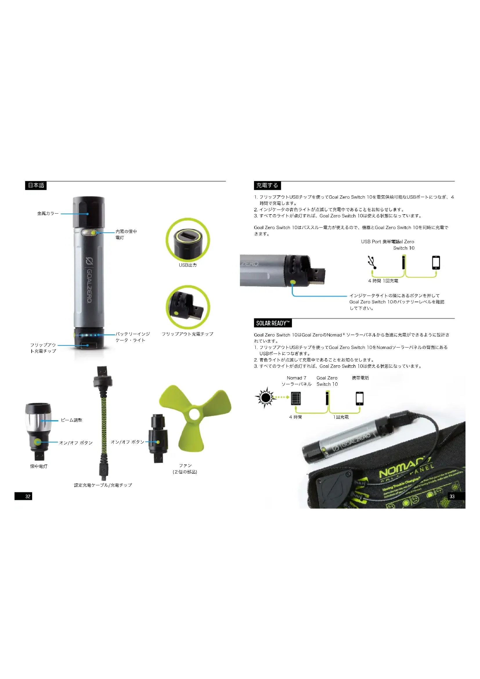 らせカチッと止めてください。カラーを左回り にひねりしっかりと締めます。 時間が経つにつれ、Goal Zero Switch 10の内 蔵リチウムバッテリーはその効率が失われます。 もしGoal Zero Switch 10が充電状態を保持し ないようであれば、あるいは機器を充分に充電 しなくなったとすれば、バッテリーの交換時期と