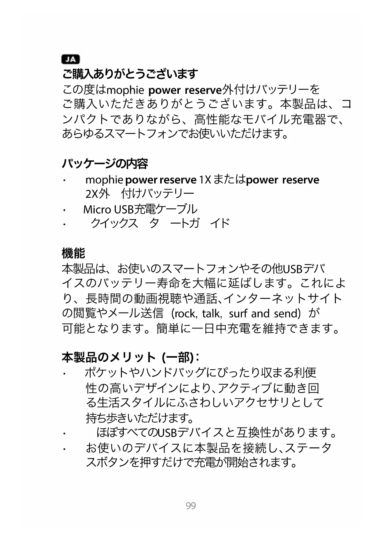 本製品は、お使いのスマートフォンやその他USBデバ イスのバッテリー寿命を大幅に延ばします。これによ り、長時間の動画視聴や通話、インターネットサイト の閲覧やメール送信 (rock, talk, surf and send) が 可能となります。簡単に一日中充電を維持できます。 本製品のメリット (一部):