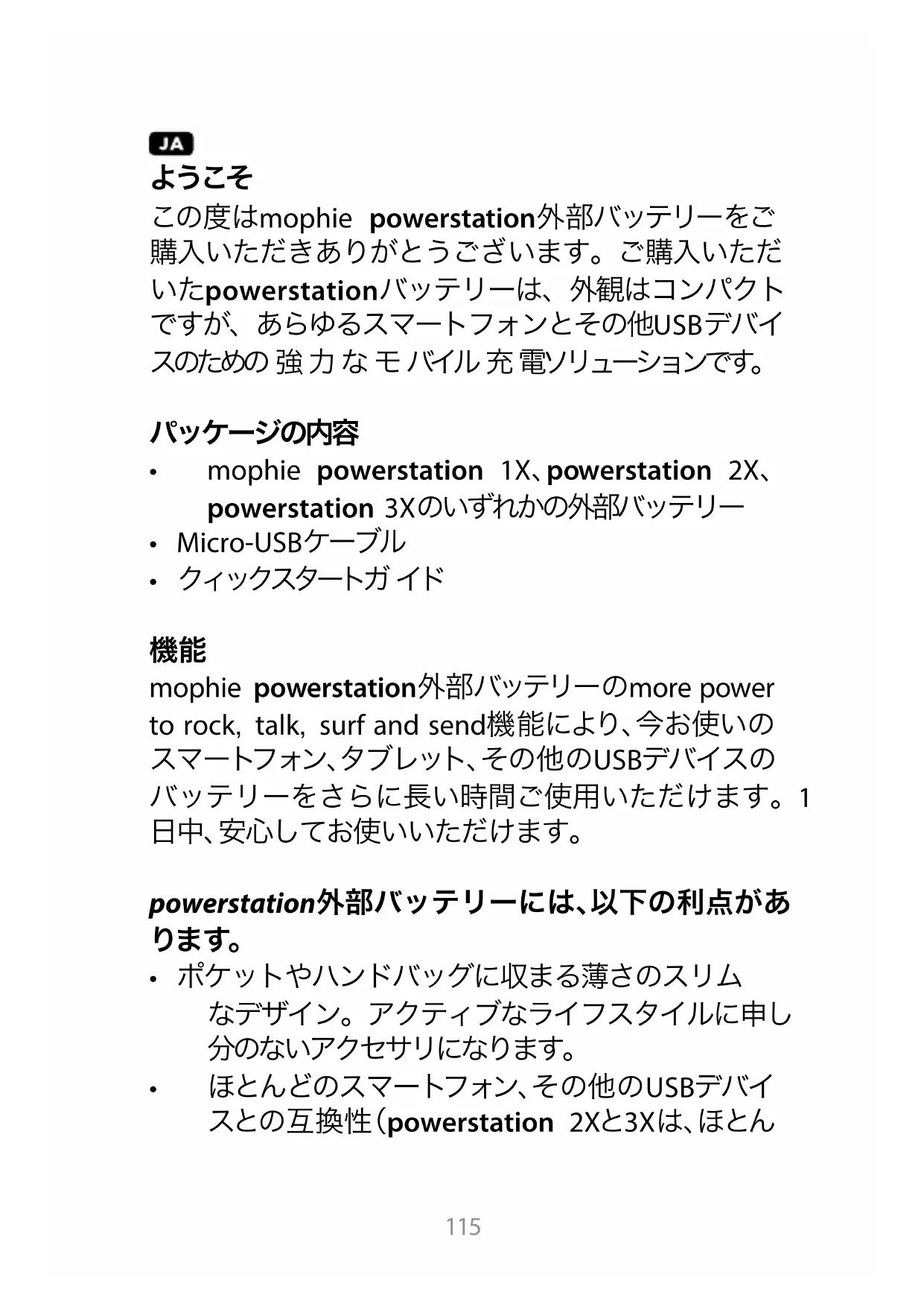 この度はmophie powerstation外部バッテリーをご 購入いただきありがとうございます。ご購入いただ いたpowerstationバッテリーは、外観はコンパクト ですが、あらゆるスマートフォンとその他USBデバイ スのための 強 力 な モ バイル 充 電ソリューションです。
