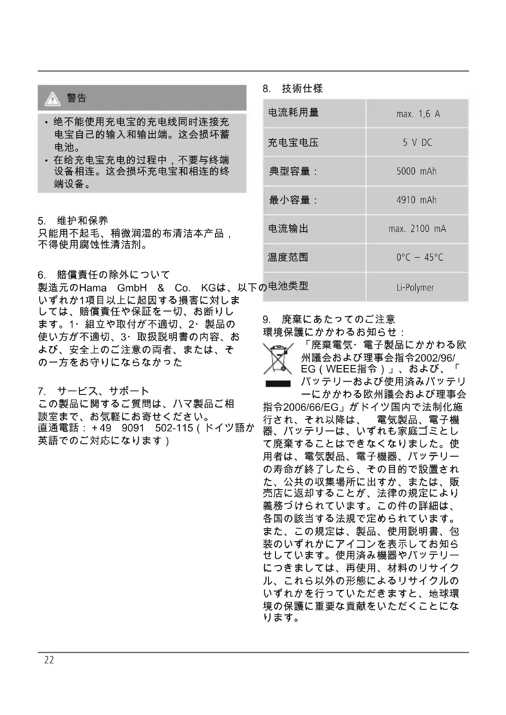 消費電流 最大 1,6 A パワーパックの電圧 5 V DC 公称容量: 5000 mAh 最小容量: 4910 mAh 出力電流 最大 2100 mA 温度範囲 0°C – 45°C 電池のタイプ リチウムポリマー