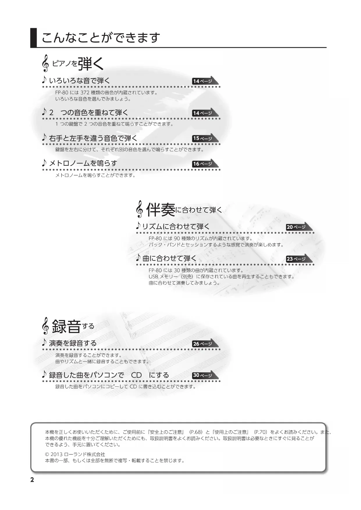 本機を正しくお使いいただくために、ご使用前に『安全上のご注意』(P.68)と『使用上のご注意』(P.70)をよくお読みください。また、本機の優れた機能を十分ご理解いただくためにも、取扱説明書をよくお読みください。取扱説明書は必要なときにすぐに見ることができるよう、手元に置いてください。© 2013 ローランド株式会社 本書の一部、もしくは全部を無断で複写・転載することを禁じます。 2こんなことができます