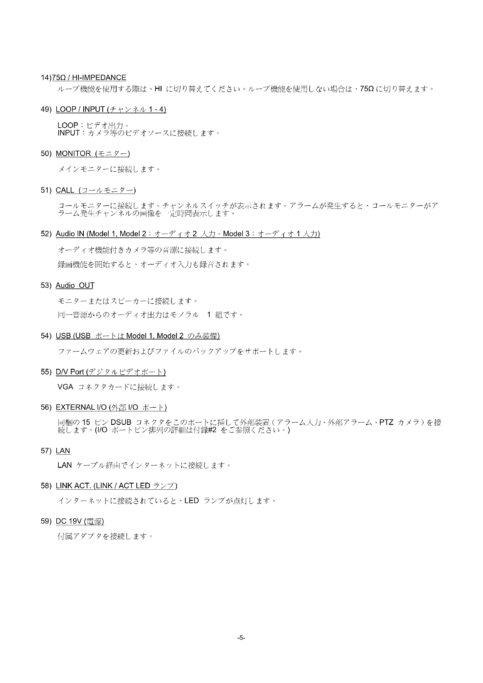 同梱の 15 ピン DSUB コネクタをこのポートに挿して外部装置(アラーム入力、外部アラーム、PTZ カメラ)を接 続します。(I/O ポートピン排列の詳細は付録#2 をご参照ください。)