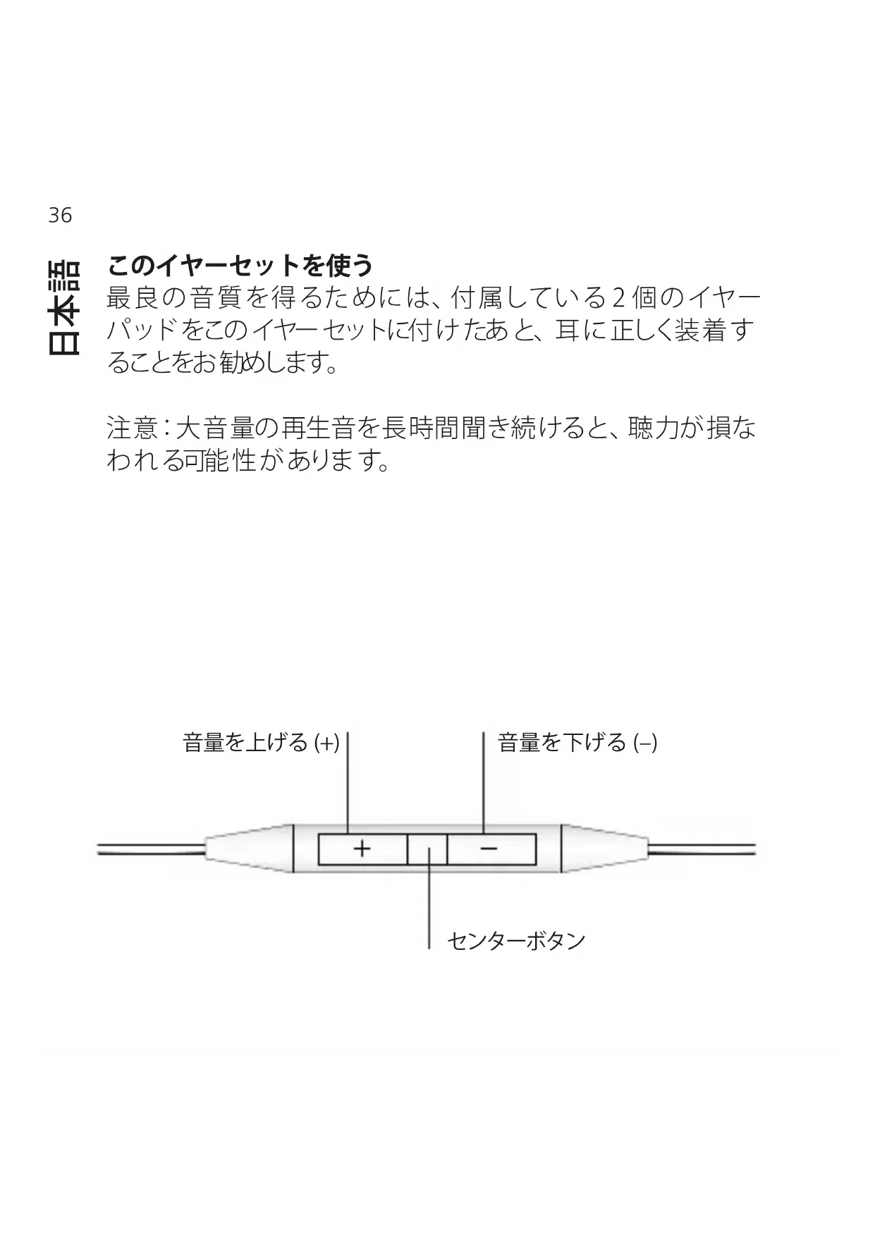 ッド をこの イヤー セットに付 け たあ と、耳 に 正しく装 着 す ることをお 勧めします。 注 意:大 音 量 の 再 生 音 を 長 時 間 聞 き 続 け る と 、聴 力 が 損 な わ れ る可能 性 が ありま す。