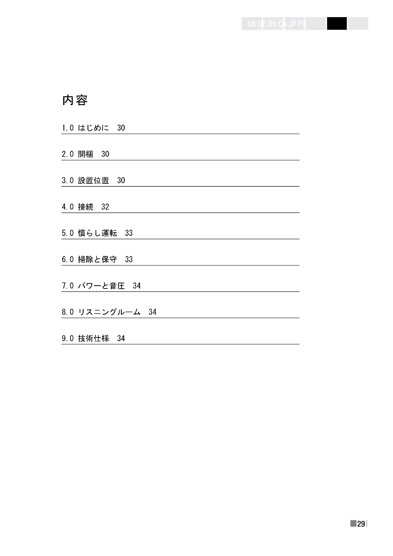 当社スピーカーの最も代表的な仕様を表2にまとめました。スピーカーには数えきれな いほどの評価方法がありますが、「スピーカーが実際にどのようなサウンドを出すか」 がわかるものは一つもありません。他と比較したスピーカーの優劣を決めるのはご自分 の耳しかありません。当社のスピーカーの例に漏れず、DALI OPTICONシリーズも音楽を 最大限忠実に再現できるよう設計されています。 新しいDALI OPTICONをお楽しみください。35 UK DE DK CN JP FR SOMMAIRE