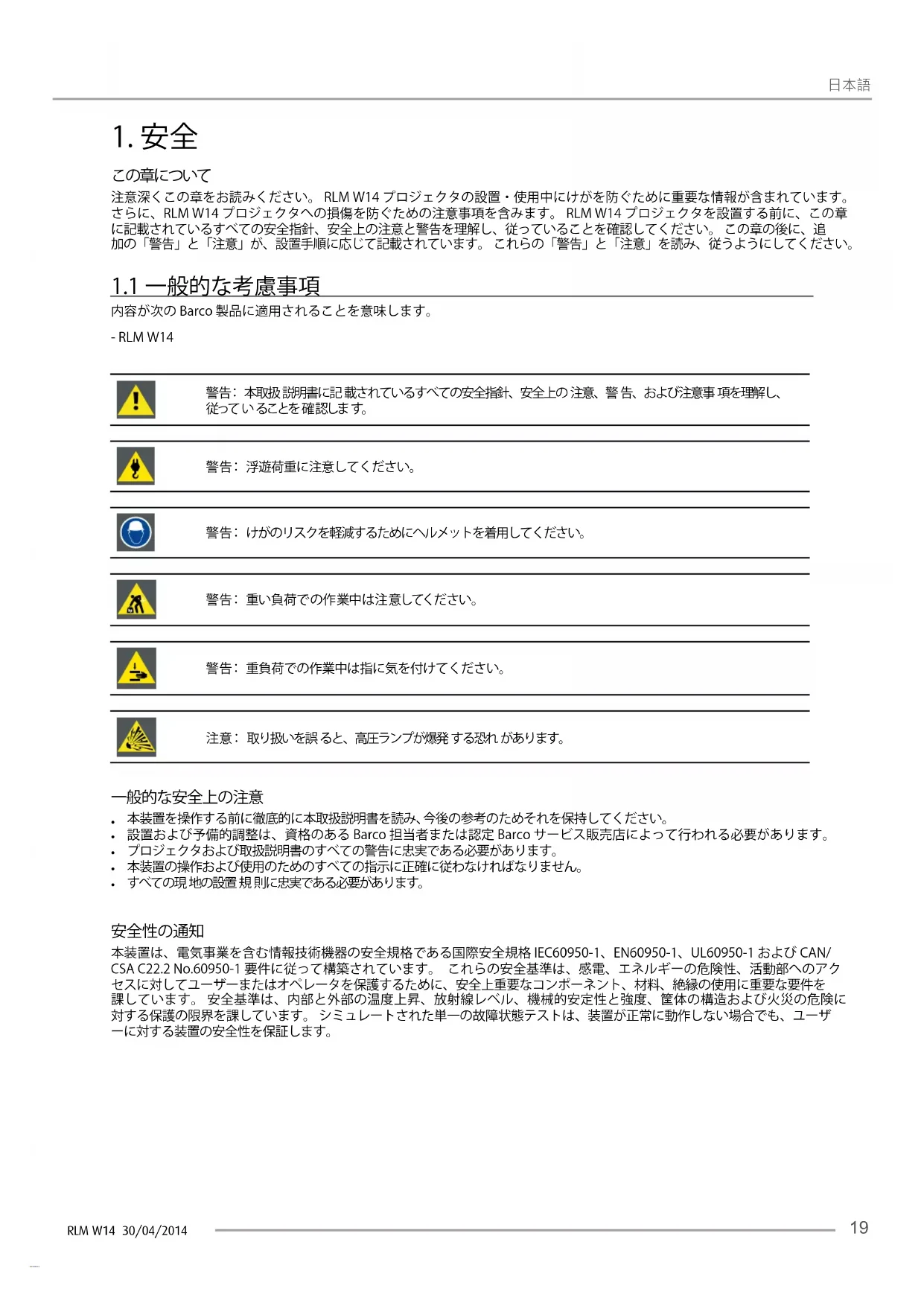 本装置を操作する前に徹底的に本取扱説明書を読み、今後の参考のためそれを保持してください。 設置および予備的調整は、資格のある Barco 担当者または認定 Barco サービス販売店によって行われる必要があります。 プロジェクタおよび取扱説明書のすべての警告に忠実である必要があります。 本装置の操作および使用のためのすべての指示に正確に従わなければなりません。 すべての現 地の設置 規 則に忠実である必要があります。 本装置は、電気事業を含む情報技術機器の安全規格である国際安全規格 IEC60950-1、EN60950-1、UL60950-1 および CAN/CSA C22.2 No.60950-1 要件に従って構築されています。 これらの安全基準は、感電、エネルギーの危険性、活動部へのアクセスに対してユーザーまたはオペレータを保護するために、安全上重要なコンポーネント、材料、絶縁の使用に重要な要件を課しています。 安全基準は、内部と外部の温度上昇、放射線レベル、機械的安定性と強度、筐体の構造および火災の危険に対する保護の限界を課しています。 シミュレートされた単一の故障状態テストは、装置が正常に動作しない場合でも、ユーザーに対する装置の安全性を保証します。RLM W14 30/04/2014