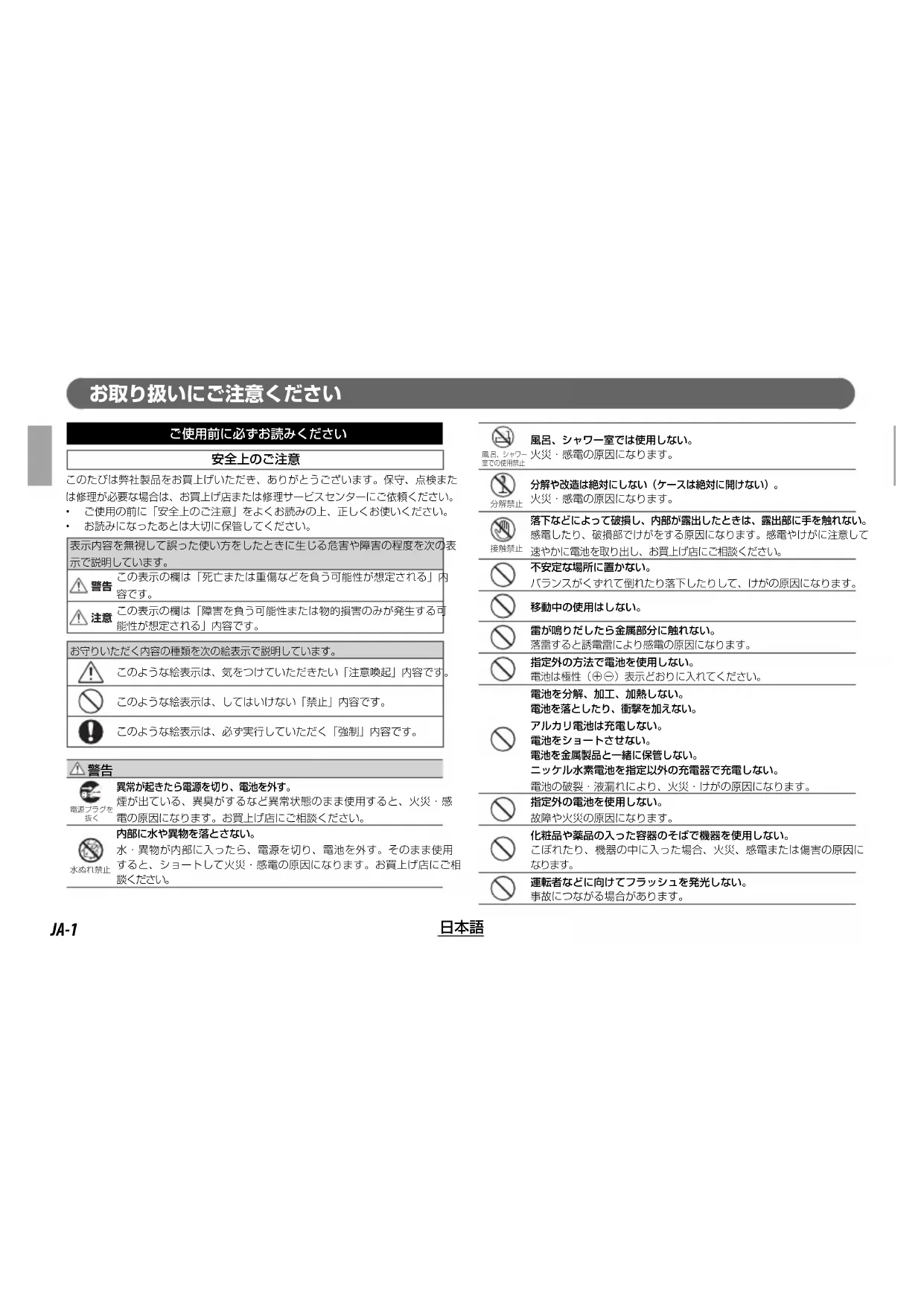異常が起きたら電源を切り、電池を外す。煙が出ている、異臭がするなど異常状態のまま使用すると、火災・感電の原因になります。お買上げ店にご相談ください。水ぬれ禁止内部に水や異物を落とさない。水・異物が内部に入ったら、電源を切り、電池を外す。そのまま使用すると、ショートして火災・感電の原因になります。お買上げ店にご相談ください。 呂、シャワー室での使用禁止風呂、シャワー室では使用しない。火災・感電の原因になります。 分解や改造は絶対にしない(ケースは絶対に開けない)。火災・感電の原因になります。 落下などによって破損し、内部が露出したときは、露出部に手を触れない。感電したり、破損部でけがをする原因になります。感電やけがに注意して速やかに電池を取り出し、お買上げ店にご相談ください。不安定な場所に置かない。バランスがくずれて倒れたり落下したりして、けがの原因になります。移動中の使用はしない。雷が鳴りだしたら金属部分に触れない。落雷すると誘電雷により感電の原因になります。指定外の方法で電池を使用しない。電池は極性(CD)表示どおりに入れてください。電池を分解、加工、加熱しない。電池を落としたり、衝撃を加えない。アルカリ電池は充電しない。電池をショートさせない。電池を金属製品と一緒に保管しない。ニッケル水素電池を指定以外の充電器で充電しない。電池の破裂・液漏れにより、火災・けがの原因になります。指定外の電池を使用しない。故障や火災の原因になります。化粧品や薬品の入った容器のそばで機器を使用しない。こぼれたり、機器の中に入った場合、火災、感電または傷害の原因になります。運転者などに向けてフラッシュを発光しない。事故につながる場合があります。 お取り扱いにご注意くださいJA-2