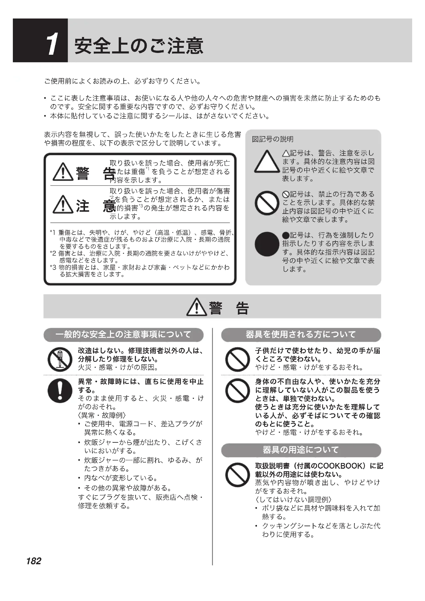 内なべが変形している。 その他の異常や故障がある。すぐにプラグを抜いて、販売店へ点検・修理を依頼する。 器具を使用される方について 子供だけで使わせたり、幼児の手が届くところで使わない。やけど・感電・けがをするおそれ。身体の不自由な人や、使いかたを充分に理解していない人がこの製品を使うときは、単独で使わない。使うときは充分に使いかたを理解している人が、必ずそばについてその確認のもとに使うこと。やけど・感電・けがをするおそれ。 取扱説明書(付属のCOOKBOOK)に記載以外の用途には使わない。蒸気や内容物が噴き出し、やけどやけがをするおそれ。〈してはいけない調理例〉 ポリ袋などに具材や調味料を入れて加