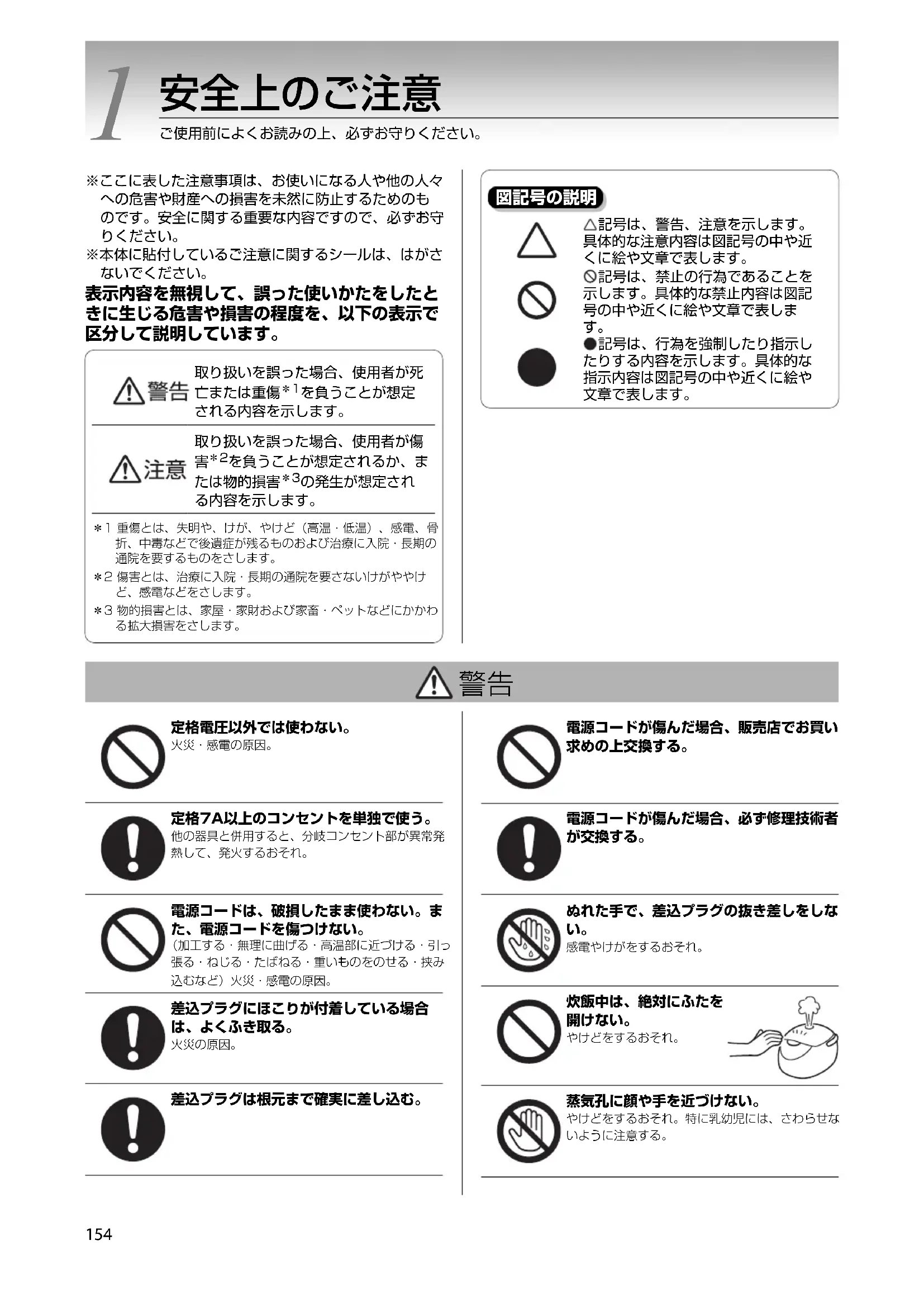 を負うことが想定されるか、または物的損害 の発生が想定される内容を示します。*1重傷とは、失明や、けが、やけど(高温・低温)、感電、骨折、中毒などで後遺症が残るものおよび治療に入院・長期の通院を要するものをさします。*2傷害とは、治療に入院・長期の通院を要さないけがややけど、感電などをさします。*3物的損害とは、家屋・家財および家畜・ペットなどにかかわる拡大損害をさします。 記号は、警告、注意を示します。具体的な注意内容は図記号の中や近くに絵や文章で表します。記号は、禁止の行為であることを示します。具体的な禁止内容は図記号の中や近くに絵や文章で表しま 記号は、行為を強制したり指示したりする内容を示します。具体的な指示内容は図記号の中や近くに絵や文章で表します。 定格電圧以外では使わない。火災・感電の原因。定格7A以上のコンセントを単独で使う。他の器具と併用すると、分岐コンセント部が異常発熱して、発火するおそれ。電源コードは、破損したまま使わない。また、電源コードを傷つけない。(加工する・無理に曲げる・高温部に近づける・引っ張る・ねじる・たばねる・重いものをのせる・挟み込むなど)火災・感電の原因。差込プラグにほこりが付着している場合は、よくふき取る。火災の原因。差込プラグは根元まで確実に差し込む。電源コードが傷んだ場合、販売店でお買い求めの上交換する。電源コードが傷んだ場合、必ず修理技術者が交換する。ぬれた手で、差込プラグの抜き差しをしな 感電やけがをするおそれ。炊飯中は、絶対にふたを開けない。やけどをするおそれ。蒸気孔に顔や手を近づけない。やけどをするおそれ。特に乳幼児には、さわらせないように注意する。