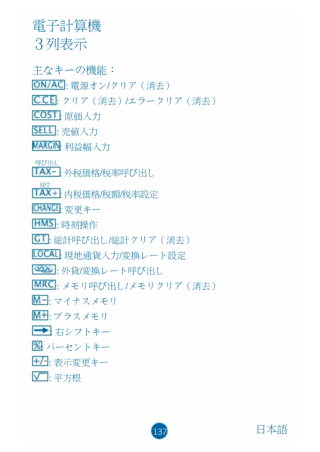 E : エラー表示、ディスプレイが「E」を示している場 合、[ON/AC]または[CE]を押すことでエラーを取り消すことが できます。139