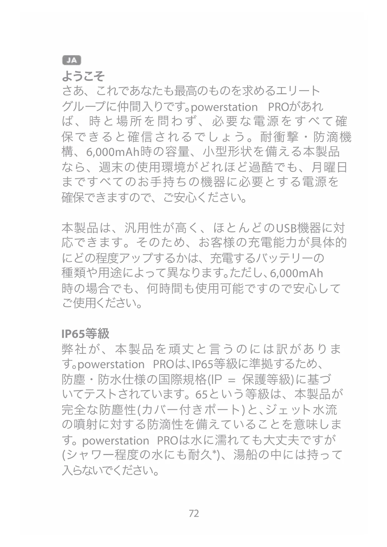 弊社が、本製品を頑丈と言うのには証,Thら。powerstation PROは、IP65等級に準拋するた、防塵·防水仕樣の國際規格(IP = 保護等級)に基てテストさててま。65と等級は、本製品が完全な防塵性(力ハ一付きロト)と、戦卜水流の噴射に对应的防滴性を備ててると意味ま。powerstation PROは水に濡ても大丈夫ですか(シャフ一程度の水にも耐久*)、湯船の中には持て入らないでくだせ。