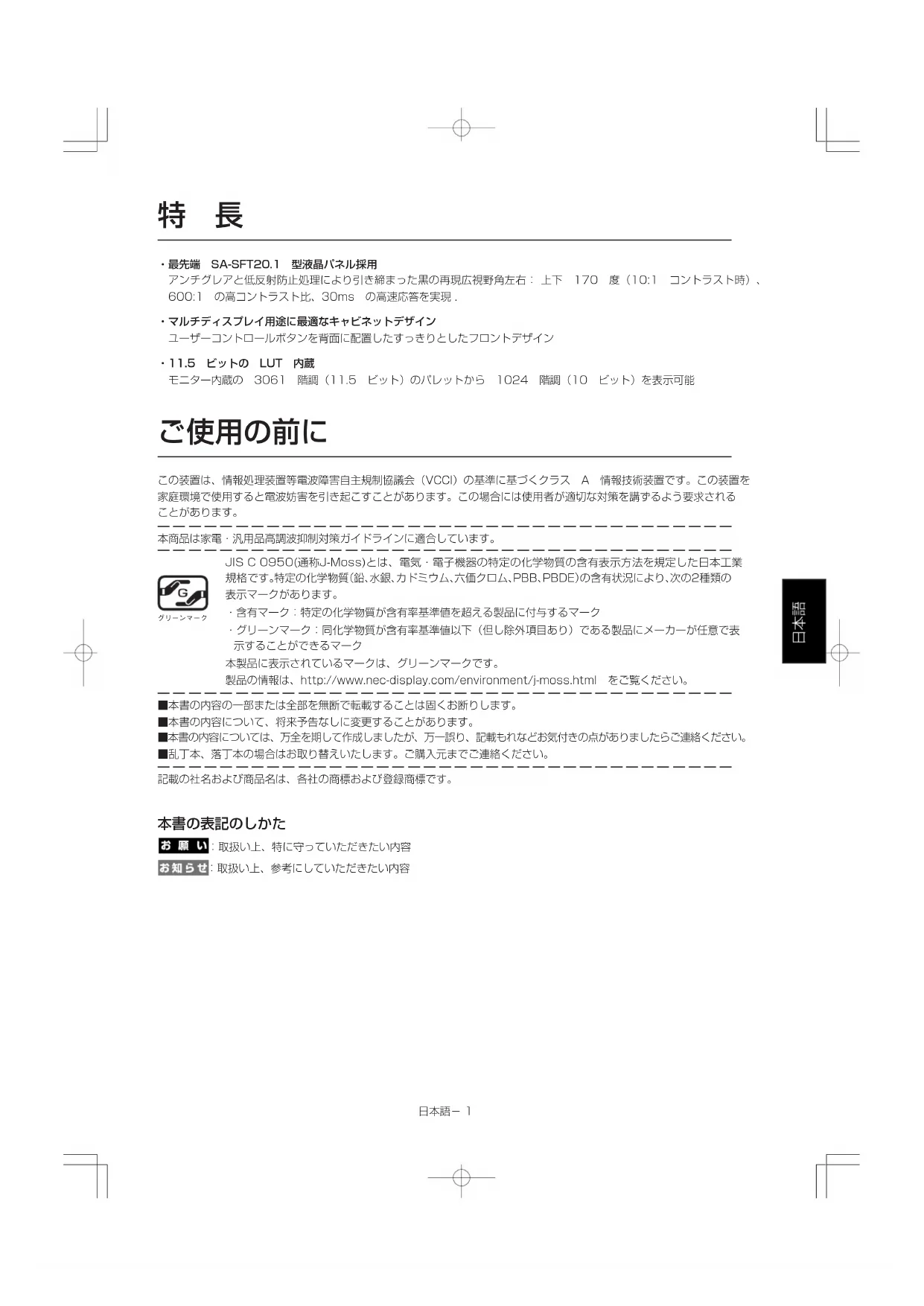 特定の化学物質(鉛、水銀、カドミウム、六価クロム、PBB、PBDE)の含有状況により、次の2種類の 表示マークがあります。 ・含有マーク:特定の化学物質が含有率基準値を超える製品に付与するマーク ・グリーンマーク:同化学物質が含有率基準値以下(但し除外項目あり)である製品にメーカーが任意で表 示することができるマーク 本製品に表示されているマークは、グリーンマークです。 製品の情報は、http://www.nec-display.com/environment/j-moss.html をご覧ください。 ■本書の内容の一部または全部を無断で転載することは固くお断りします。 ■本書の内容について、将来予告なしに変更することがあります。 ■本書の内容については、万全を期して作成しましたが、万一誤り、記載もれなどお気付きの点がありましたらご連絡ください。 ■乱丁本、落丁本の場合はお取り替えいたします。ご購入元までご連絡ください。 記載の社名および商品名は、各社の商標および登録商標です。