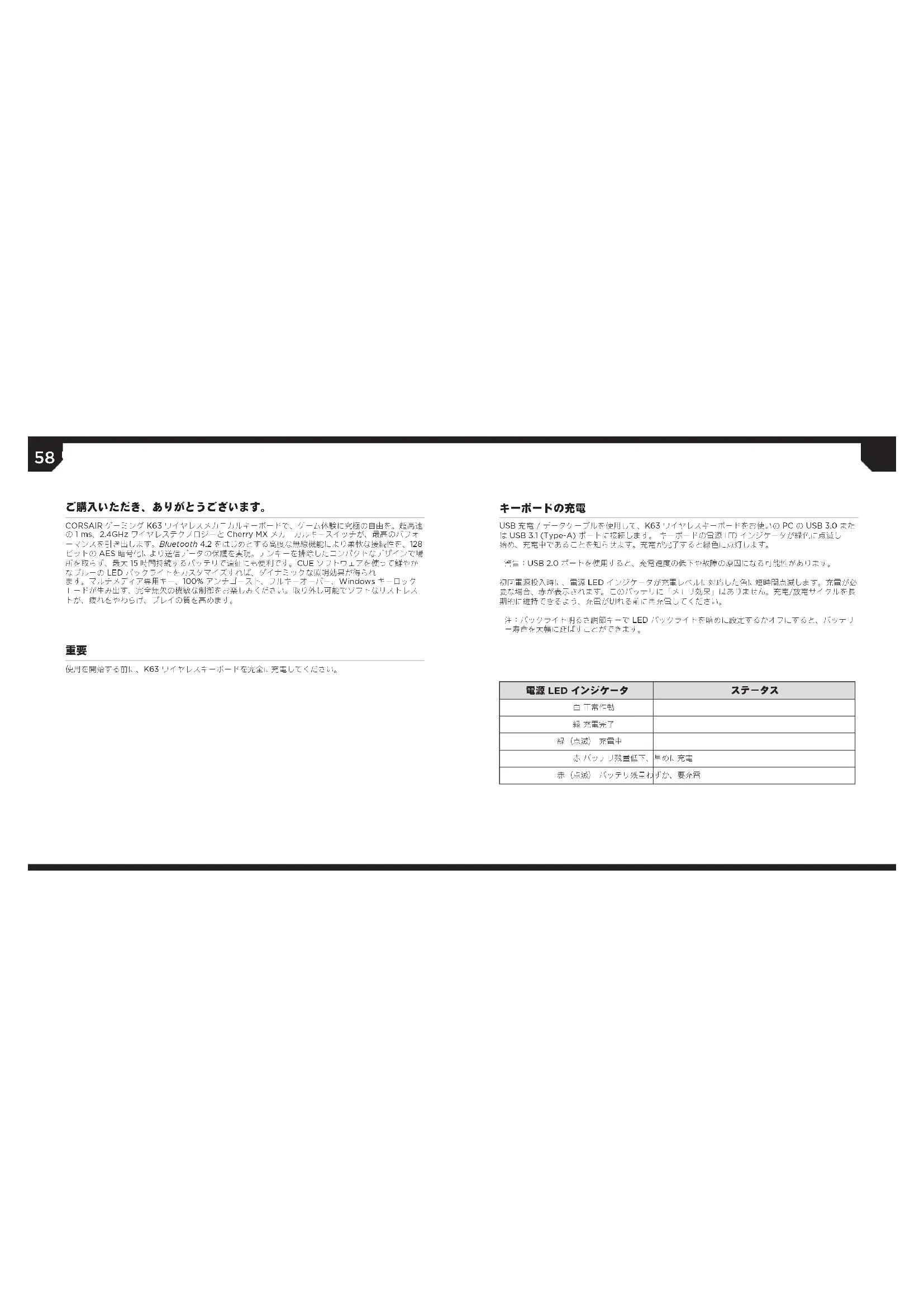 操作時可能會發生以下兩種情況: (1) 本裝置可能不會產生有害干擾,和 (2) 本裝置必須接受所接收到的任何干擾,包括可能導致不 希望出現的操作的干擾。58 59 CORSAIR ゲーミング K63 ワイヤレスメカニカルキーボードで、ゲーム体験に究極の自由を。超高速 の 1 ms、2.4GHz ワイヤレステクノロジーと Cherry MX メカニカルキースイッチが、最高のパフォ ーマンスを引き出します。Bluetooth 4.2 をはじめとする高度な無線機能により柔軟な接続性を、128 ビットの AES 暗号化により送信データの保護を実現。テンキーを排除したコンパクトなデザインで場 所を取らず、最大 15 時間持続するバッテリで遠征にも便利です。CUE ソフトウェアを使って鮮やか なブルーの LED バックライトをカスタマイズすれば、ダイナミックな照明効果が得られ ます。マルチメディア専用キー、100% アンチゴースト、フルキーオーバー、Windows キーロック モードが生み出す、完全無欠の機敏な制御をお楽しみください。取り外し可能でソフトなリストレス トが、疲れをやわらげ、プレイの質を高めます。 ご購入いただき、ありがとうございます。