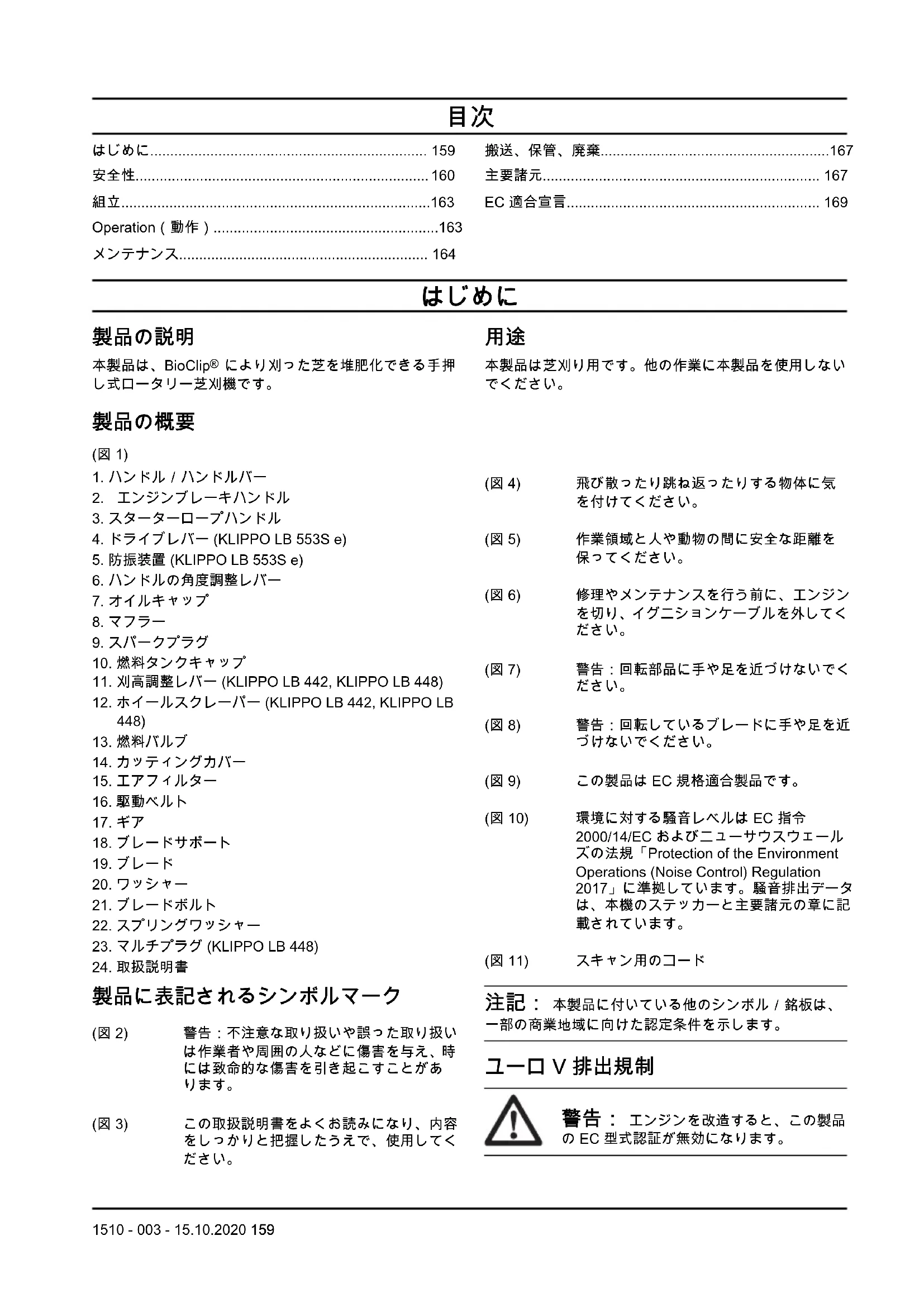 注記: 本製品に付いている他のシンボル/銘板は、 一部の商業地域に向けた認定条件を示します。 ユーロ V 排出規制 警告: エンジンを改造すると、この製品 の EC 型式認証が無効になります。 1510 - 003 - 15.10.2020 159製造物責任 製造物責任法に基づき、当社は、次の場合については本 製品を原因とする損傷について責任を負いません。