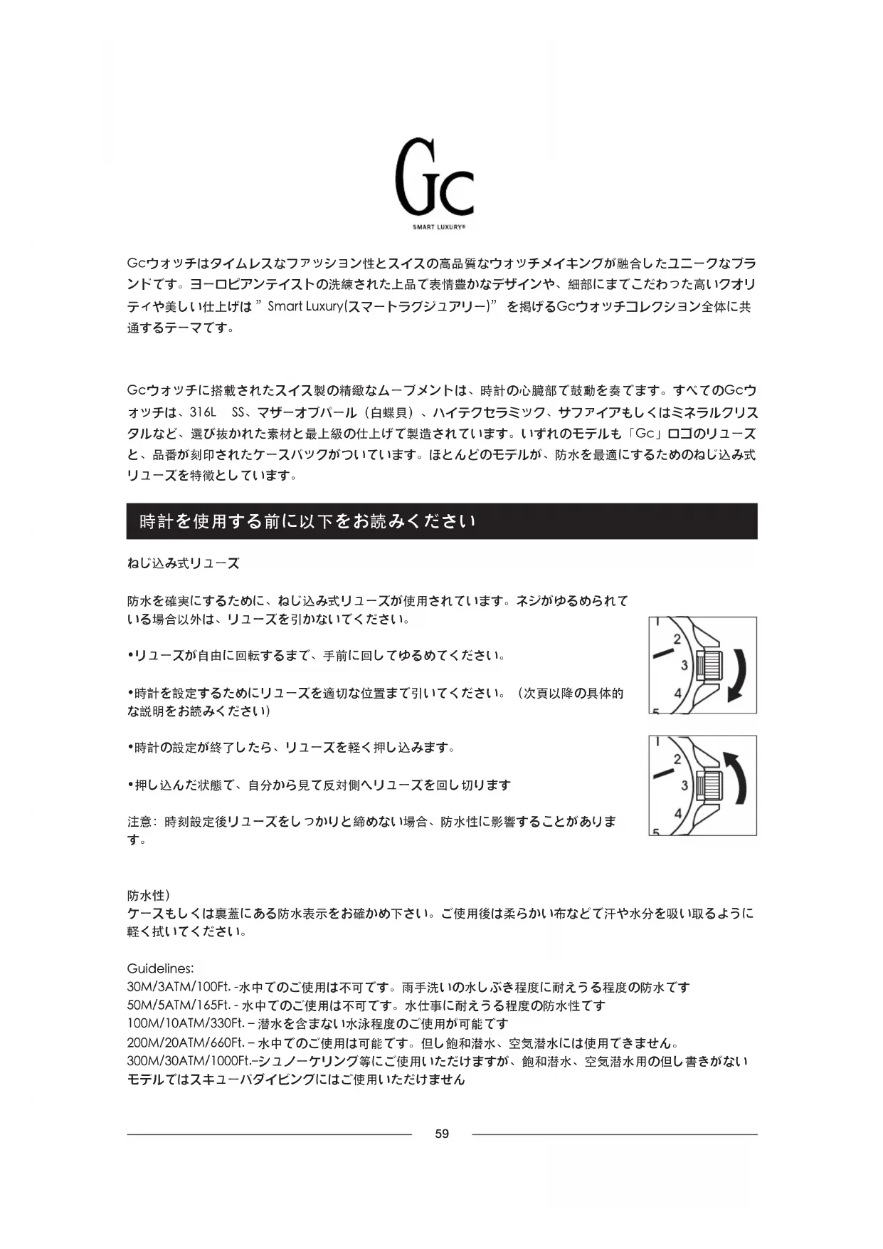 お求めいただいたGcオートマティックは100メートル(10気圧)/330フィートまでの圧力に耐えられる防水機 能を備えていますが、時計に塩水や薬品等がかかった場合は清潔な水をかけてやさしく洗浄し、乾いた柔らかい