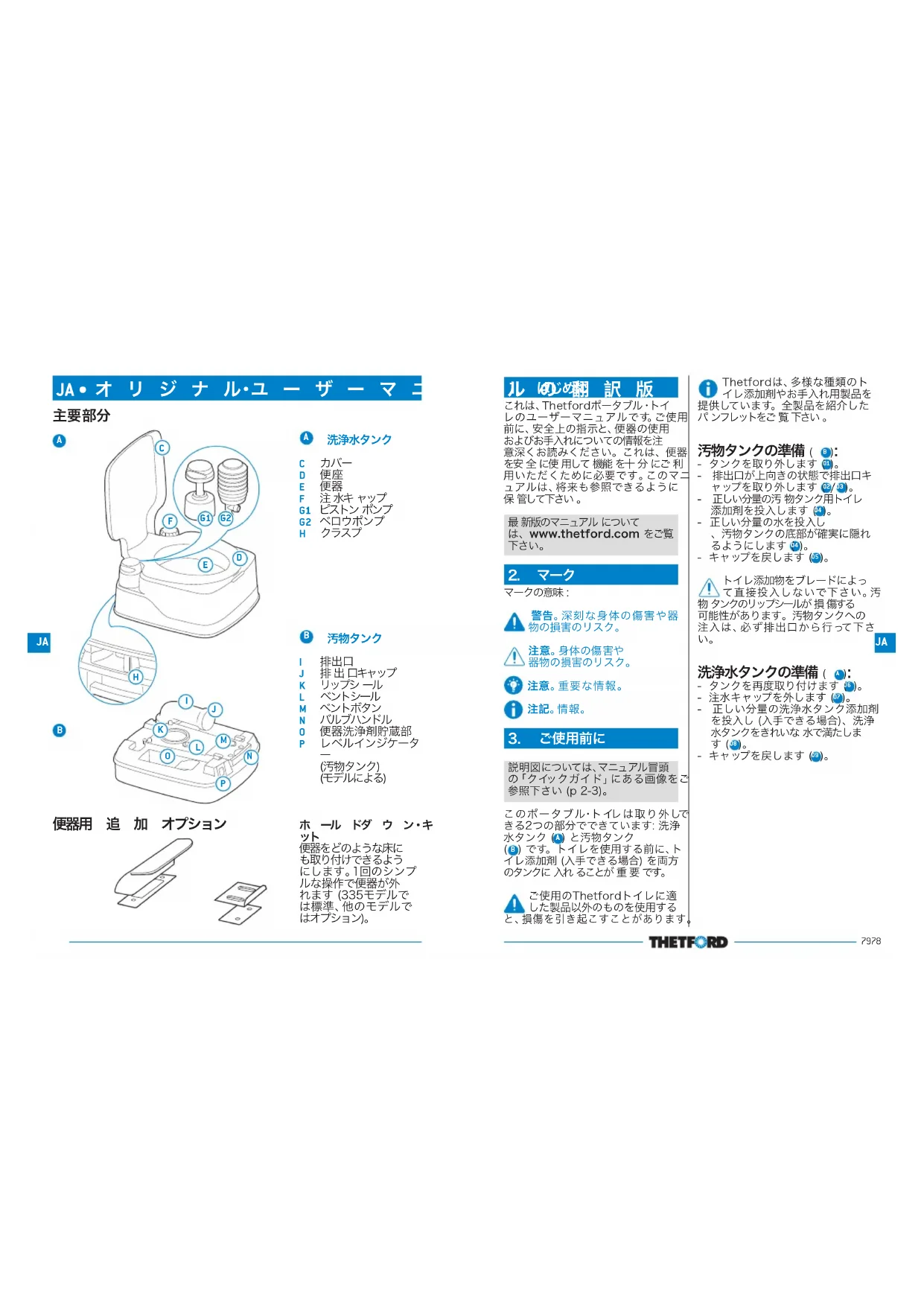 こ れ は 、T h e t f o r d ポ ー タ ブ ル ・ト イ レ の ユ ー ザ ー マ ニ ュ ア ル で す。ご 使 用 前 に 、安 全 上 の 指 示 と 、便 器 の 使 用 およびお手入れについての情報を注意深くお読みください。これは、便器を安 全 に使 用して 機能 を十 分 にご 利用 い た だ く た め に 必 要 で す 。こ の マ ニュ ア ル は 、将 来 も 参 照 で き る よ う に保 管して下さい 。最 新版のマニュアル については、www.thetford.comをご覧