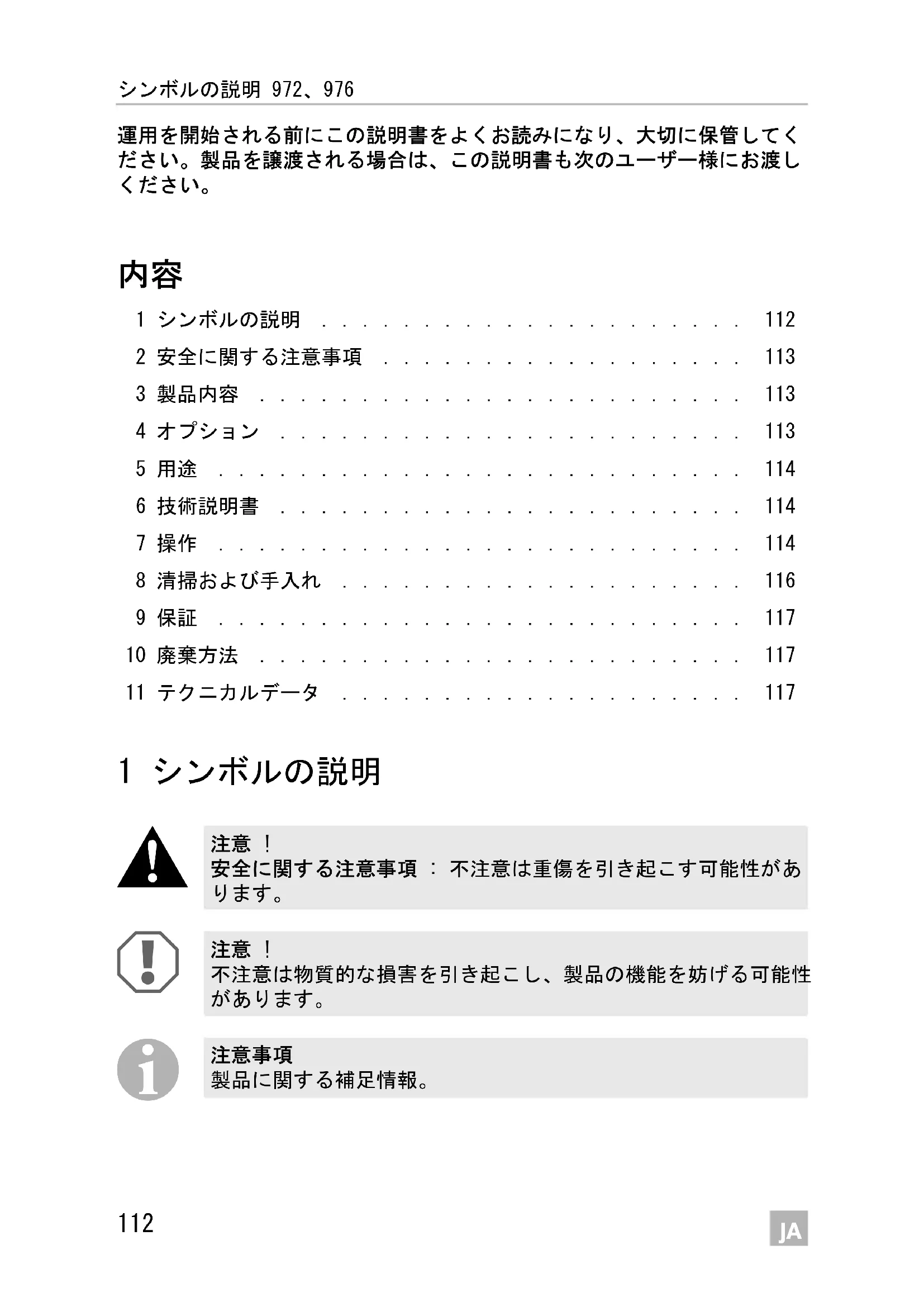 製品に関する補足情報。 970-Toilets-O-18s.book Seite 112 Montag, 27. Februar 2017 6:20 18JA 972、976 安全に関する注意事項