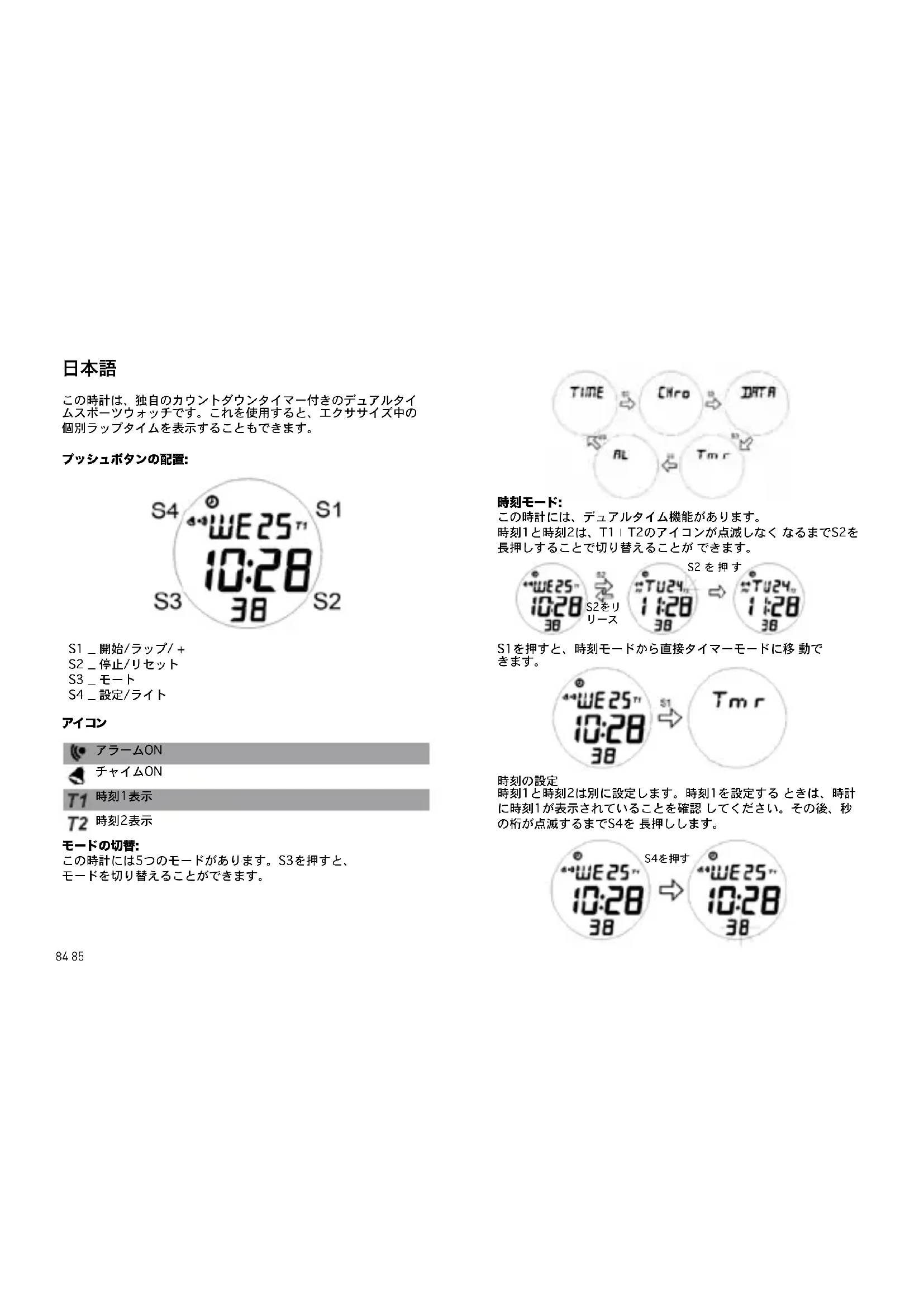 只要闹铃打开,手表就会显示闹铃图示。 如果您打开音乐,整点报时,每次按键都会有按键音。 按键功能表:84 85 この時計は、独自のカウントダウンタイマー付きのデュアルタイ ムスポーツウォッチです。これを使用すると、エクササイズ中の 個別ラップタイムを表示することもできます。 プッシュボタンの配置: S1 _ 開始/ラップ/ + S2 _ 停止/リセット S3 _ モート S4 _ 設定/ライト