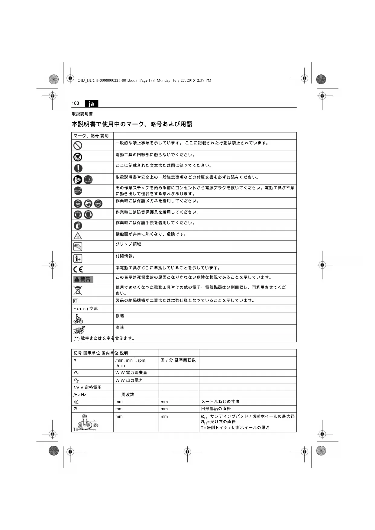 サンディングペーパー使用時における研磨平均振 m, s, kg, A, mm, V, W, Hz, N, °C, dB, min, m/s m, s, kg, A, mm, V, W, Hz, N, C, dB, min, m/s 国際単位系 (SI)で使用されている基本単位および組立単位。記号 国際単位 国内単位 説明OBJ_BUCH-0000000223-001.book Page 189 Monday, July 27, 2015 2:39 PM190