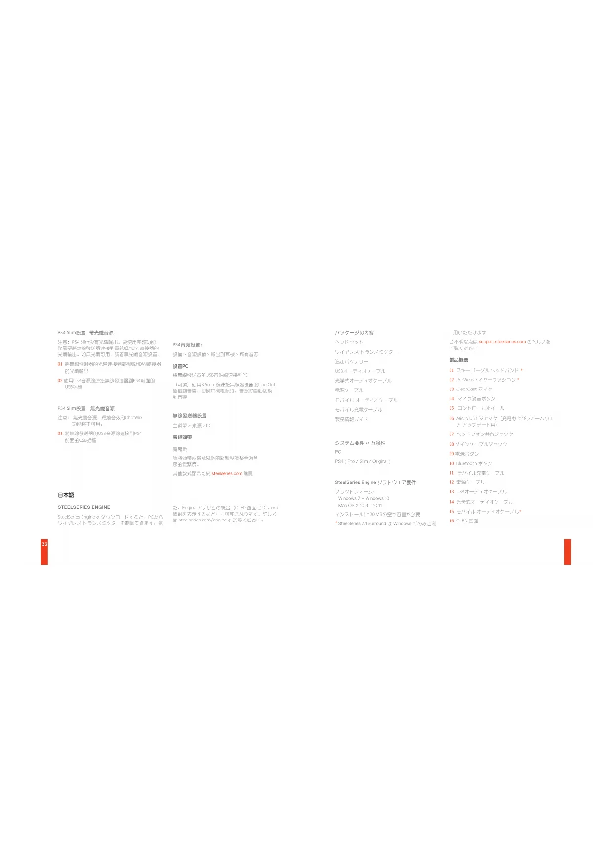 PS4 オーディオ設定 周辺機器 > オーディオ機器 >37 38 ヘッドホンへの出力 > すべての音声 PCの設定 ワイヤレス トランスミッターのUSBオーディオケ ーブルをPCに接続します (任意)ワイヤレス トランスミッターの Line Out ジャックの3.5mmケーブルをスピーカーに接続し ます。こうすると、ヘッドセットの電源をオフに したときに自動で切り替わるようになります。 ワイヤレス トランスミッターの設定 メインメニュー > ソース > PC WINDOWS の音声設定 01 「再生」で Arctis Pro Game Audio をハイライ トし、「デフォルトに設定」を選択します 02 Arctis Pro Chat Audio を選択し、「デフォルト の通信機器」を選択します 03 「録音」で Arctis Pro Chat Audio をハイライ トし、「デフォルトに設定」を選択します MAC の音声設定 01 [システム環境設定] > [サウンド] と進みます 02 [出力] タブで Arctis Pro Game Audio を選択し