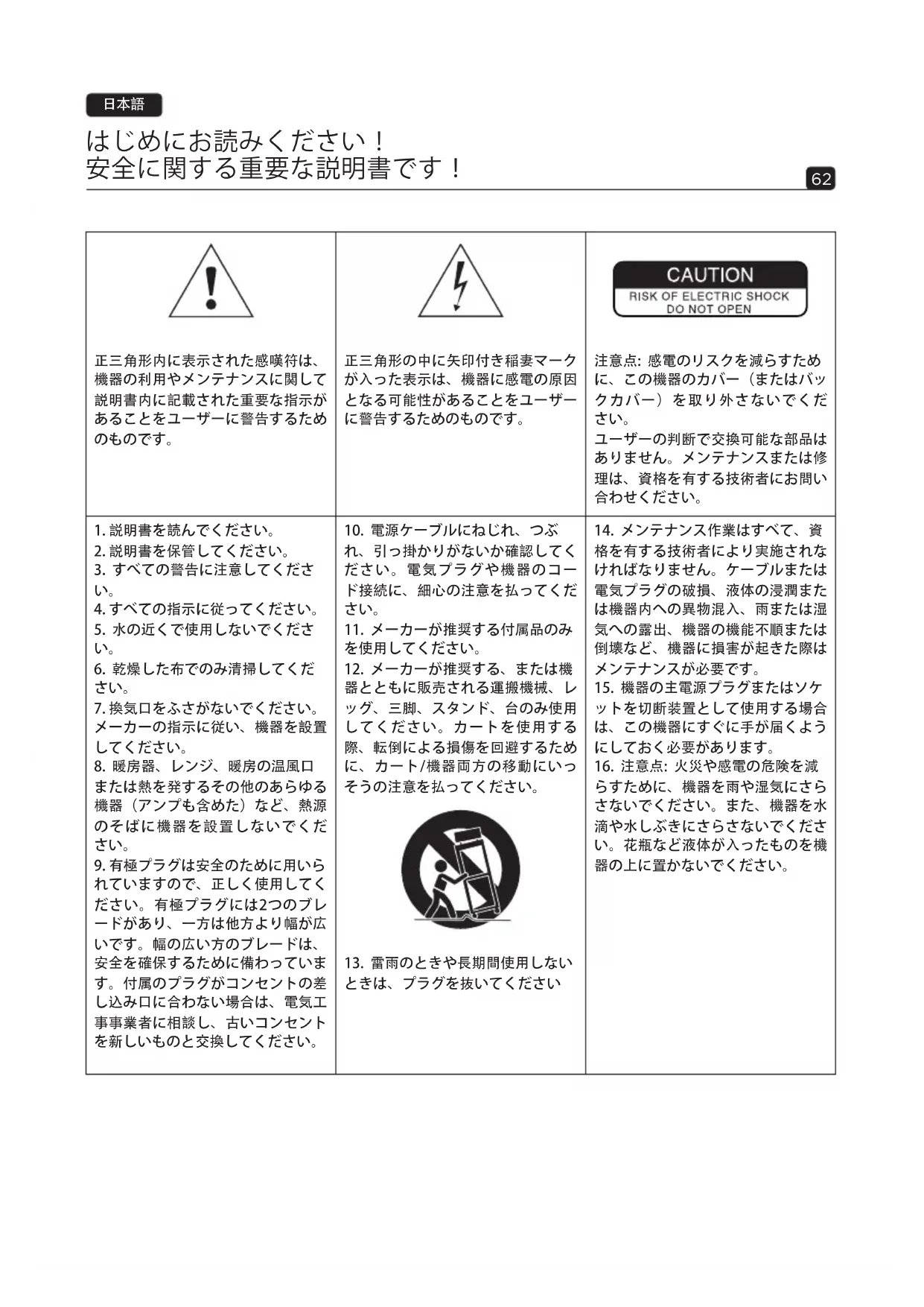 格を有する技術者により実施されな ければなりません。ケーブルまたは 電気プラグの破損、液体の浸潤また は機器内への異物混入、雨または湿 気への露出、機器の機能不順または 倒壊など、機器に損害が起きた際は メンテナンスが必要です。