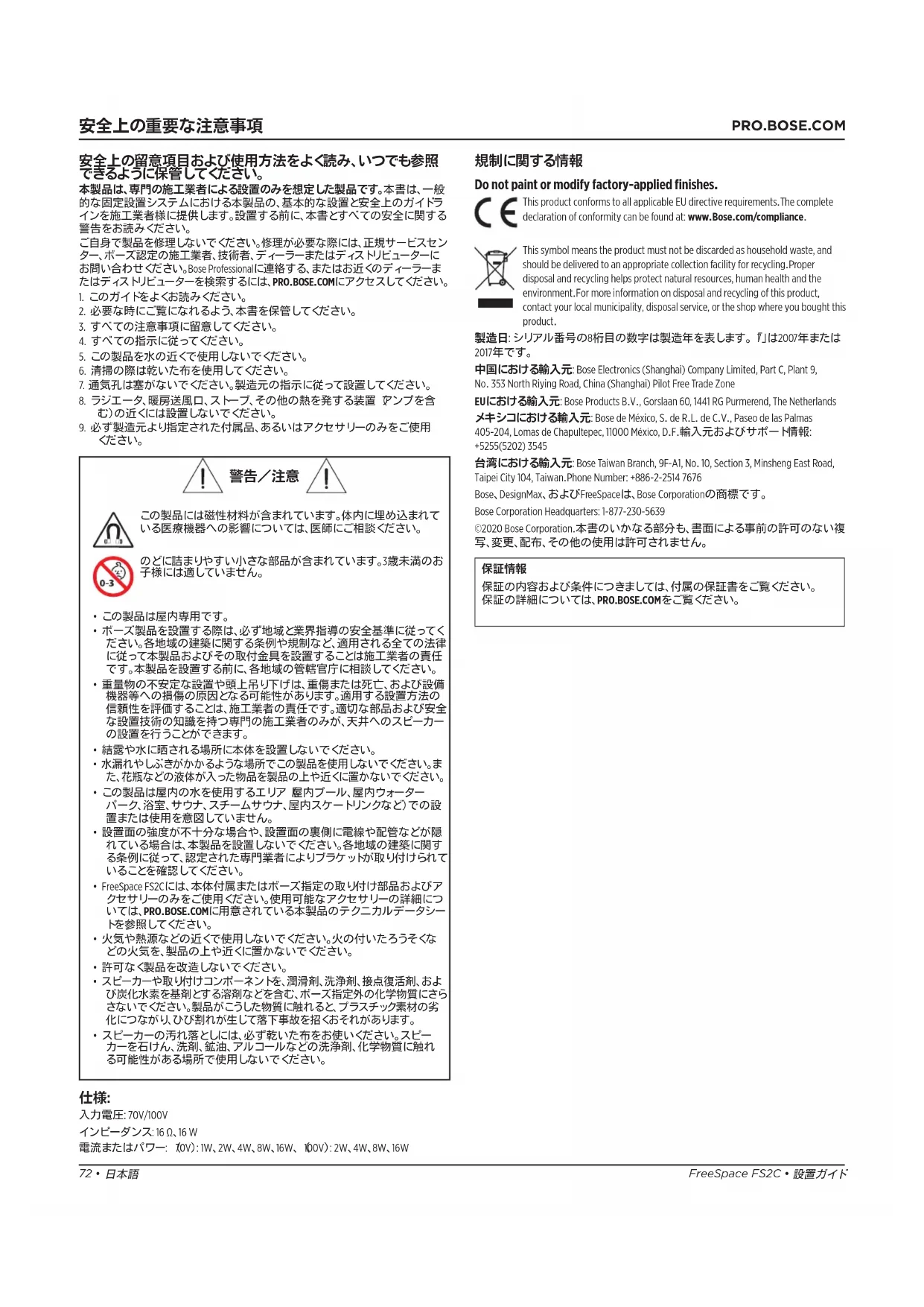 安全上の重要な注意事項 安全上の留意項目および使用方法をよく読み、いつでも参照 できるように保管してください。 本製品は、専門の施工業者による設置のみを想定した製品です。本書は、一般 的な固定設置システムにおける本製品の、基本的な設置と安全上のガイドラ インを施工業者様に提供します。設置する前に、本書とすべての安全に関する 警告をお読みください。 ご自身で製品を修理しないでください。修理が必要な際には、正規サービスセン ター、ボーズ認定の施工業者、技術者、ディーラーまたはディストリビューターに お問い合わせください。Bose Professionalに連絡する、またはお近くのディーラーま