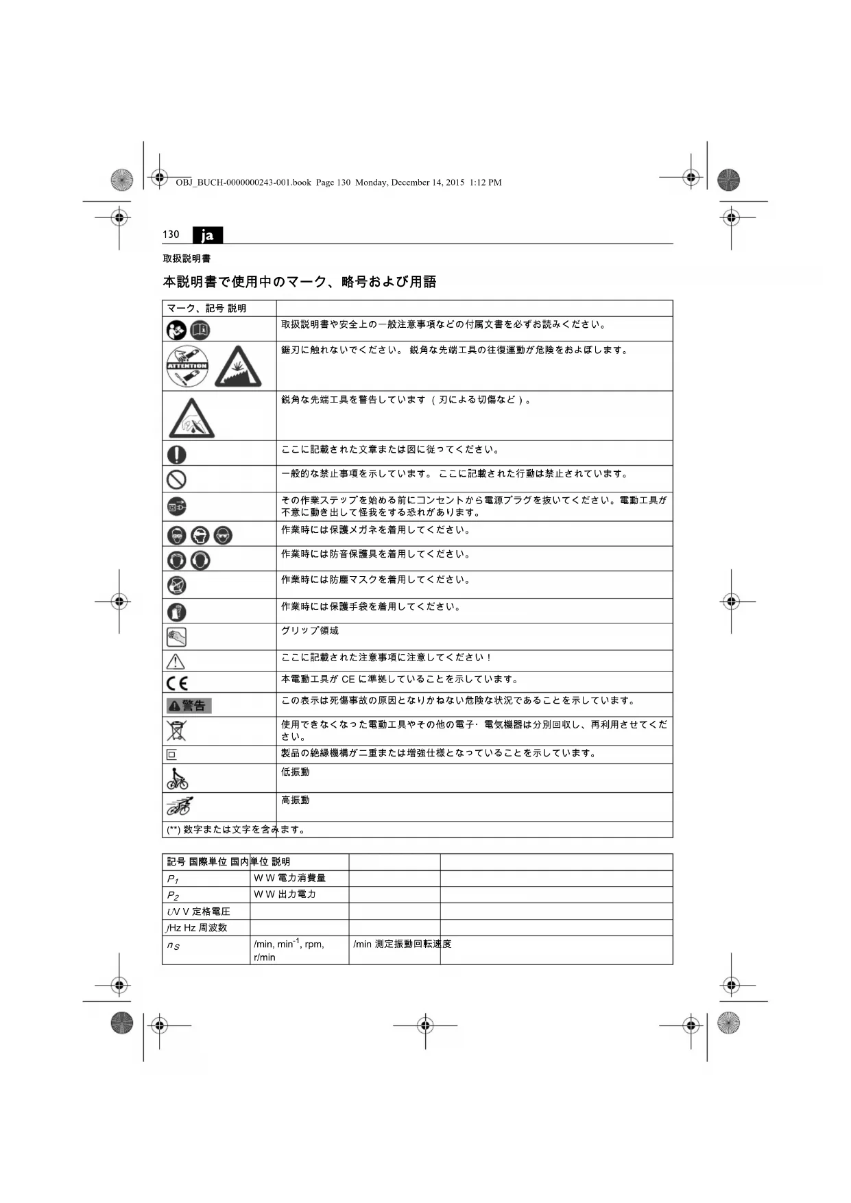 EN 60745 準拠振動加速度 (3 方向のベクトル和)m, s, kg, A, mm, V, W, Hz, N, °C, dB, min, m/s m, s, kg, A, mm, V, W, Hz, N, C, dB, min, m/s 国際単位系 (SI)で使用されている基本単位および組立単位。記号 国際単位 国内単位 説明OBJ_BUCH-0000000243-001.book Page 131 Monday, December 14, 2015 1:12 PM132