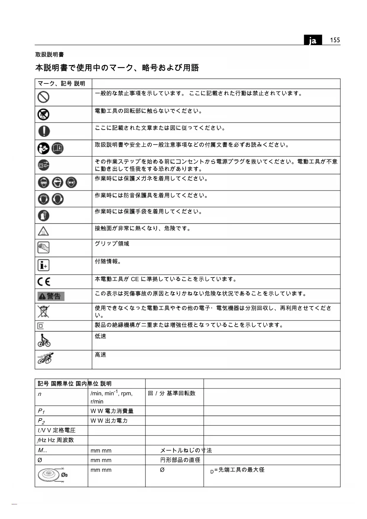 | CE | 本電動工具がCEに準拠いたします。 |