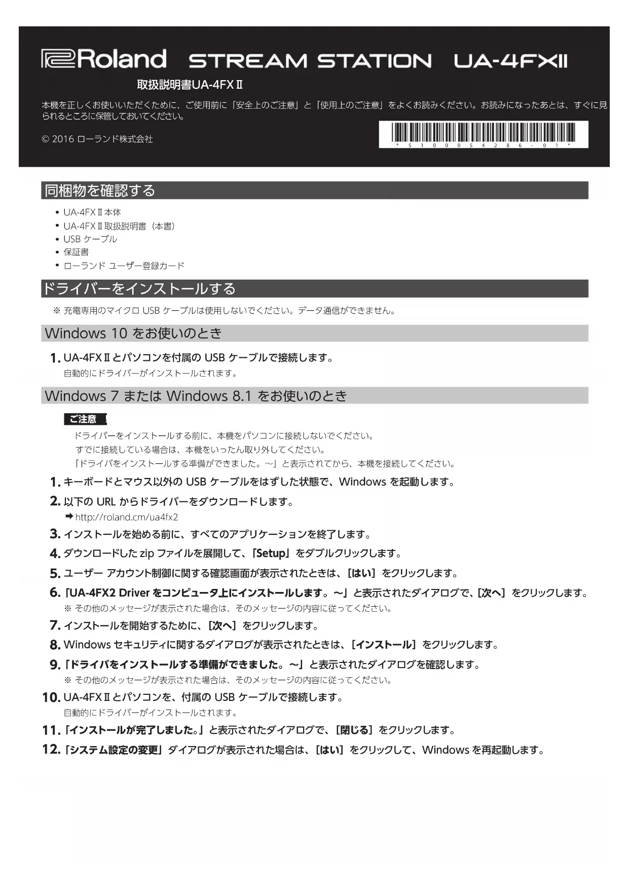 ローランド ユーザー登録カード ドライバーをインストールする ※ 充電専用のマイクロ USB ケーブルは使用しないでください。データ通信ができません。 Windows 10 をお使いのとき