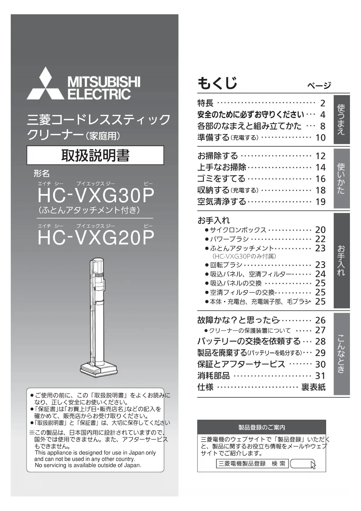 ■HC-VXG30P用 保証とアフターサービス ■この製品は、日本国内用に設計されていますので、国外では使用できません。また、アフターサービスもできません。 ■補修用性能部品の保有期間 ●当社は、このコードレススティッククリーナーの補修用性能部品を製造打切り後6年保有しています。●補修用性能部品とは、その製品の機能を維持するために必要な部品です。 ■ご不明な点や修理に関するご相談は ●お買上げの販売店か下記の「三菱電機 ご相談窓口・修理窓口」にご相談ください。