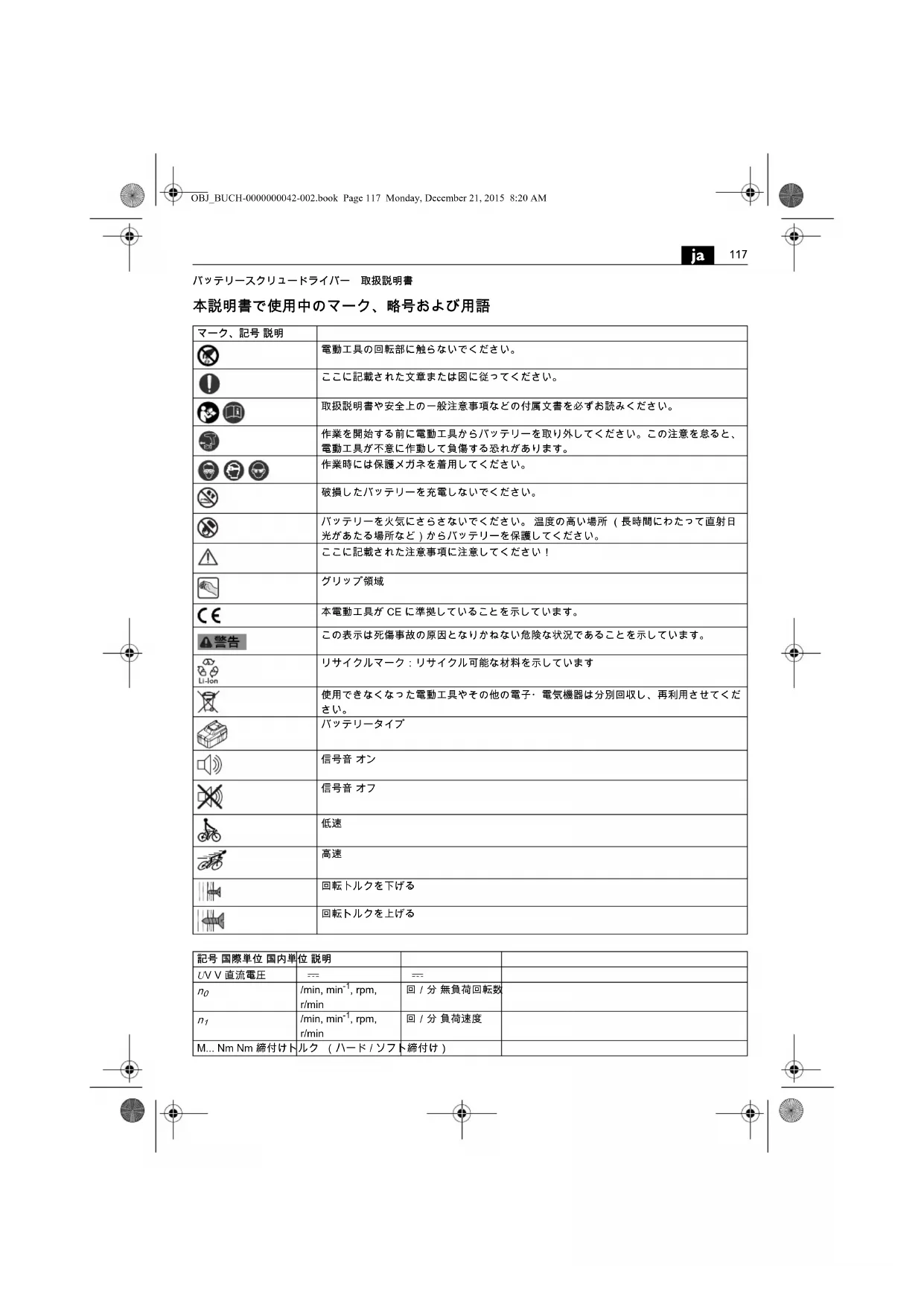 振動加速度 (ネジ締め時)m, s, kg, A, mm, V, W, Hz, N, °C, dB, min, m/s m, s, kg, A, mm, V, W, Hz, N, C, dB, min, m/s 国際単位系 (SI)で使用されている基本単位および組立単位。記号 国際単位 国内単位 説明OBJ_BUCH-0000000042-002.book Page 118 Monday, December 21, 2015 8:20 AM119