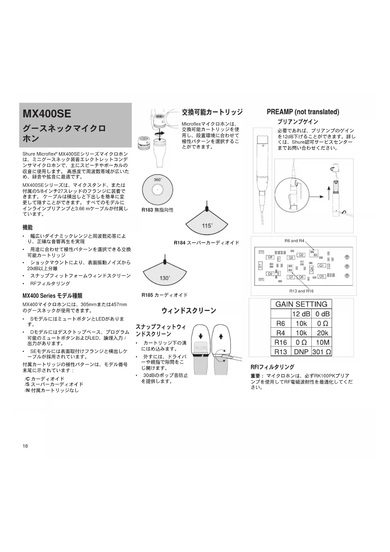 必要であれば、プリアンプのゲイン を12dB下げることができます。詳し くは、Shure認可サービスセンター までお問い合わせください。19